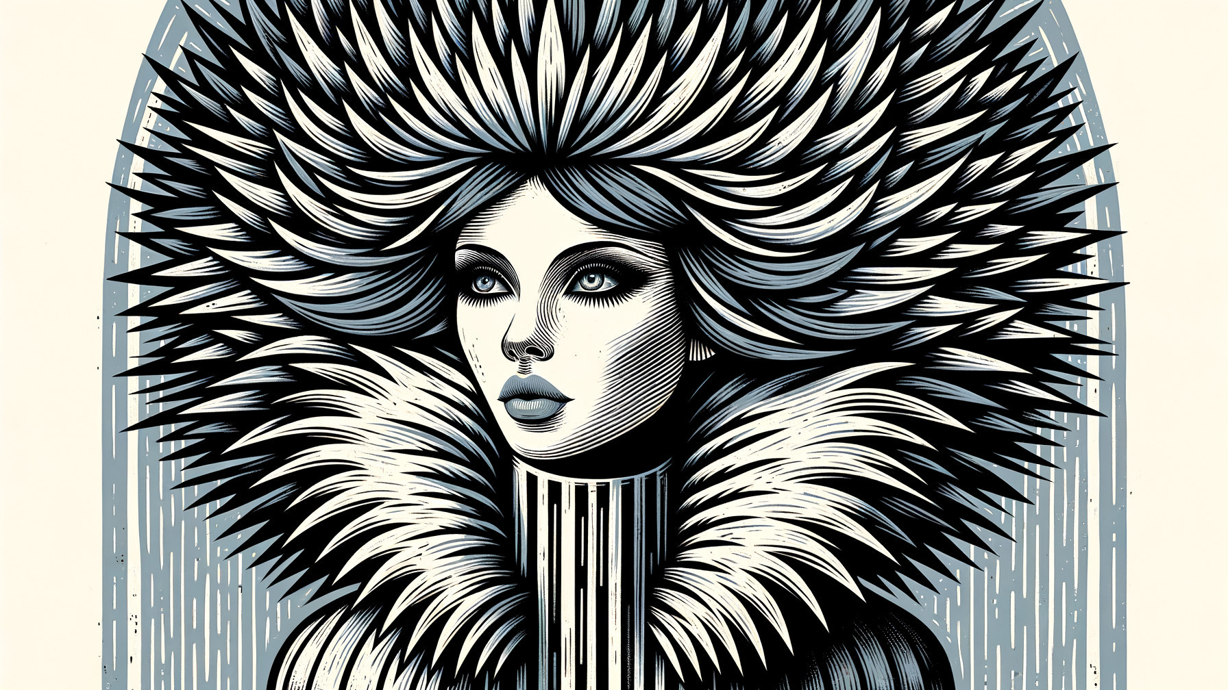 ((((Masterpiece)))), a multi-block woodcut and linocut print in a style that fuses ethereal fantasy with stark, graphic precision. The image depicts a striking hedgehog-like lady an otherworldly female figure with porcelain skin and an elegant, slender form, defined by a powerful, black key block of clean, flowing lines. Her face is carved with aesthetically perfect structure: defined cheekbones, a smooth jawline, and deep-set almond eyes rendered in an intense, flat shade of cobalt blue. Dramatic makeup enhances their allure through sharp, contrasting lines. Her lips are full and painted in a soft nude hue, carved with subtle detail. Her most extraordinary feature is her hair: a crown of gray, spiky fur-like strands radiating outward. This is achieved through countless sharp, radiating lines and stippled textures carved into the block, creating a stunning, wild visual effect. She is adorned with a high-collared, spiky fur-like garment that complements her hair, rendered with similar jagged, repetitive patterns. The background is a soft-focused, muted dark ambiance, printed in deep indigo and charcoal, with subtle falling snowflakes added as tiny, scattered dots of untouched paper. The overall mood is one of serene yet powerful otherworldliness, where biomorphic elegance meets graphic boldness. The high contrast and intricate detail emphasize her mythical, untamed beauty. Graphic style, linocut, woodcut, key block, bold outlines, high-contrast, intricate, biomorphic, atmospheric, textured, stylistic, otherworldly.