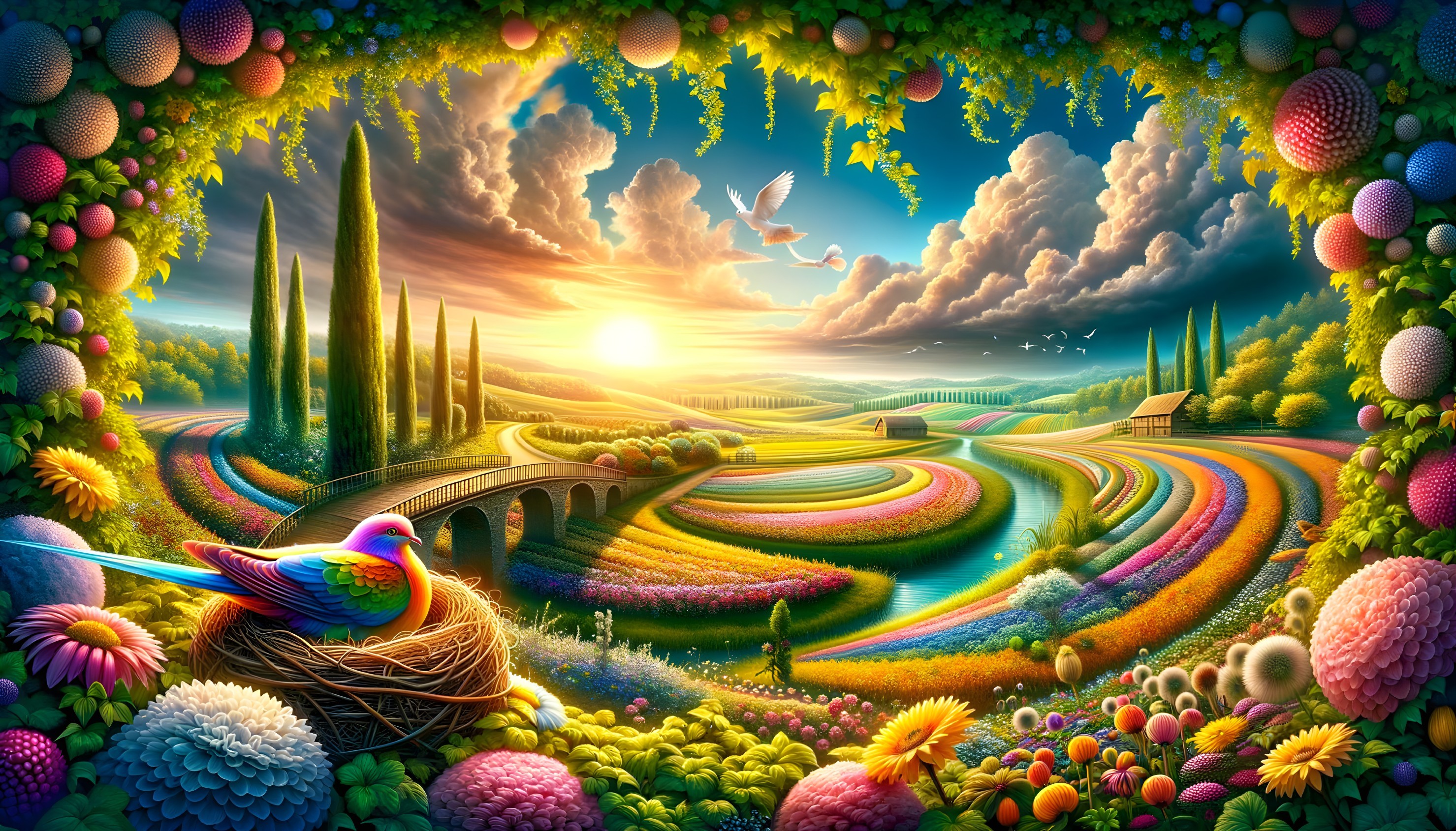 A vibrant, surreal landscape with lush hills, a rainbow-hued bird, and whimsical flora under a sunset sky.