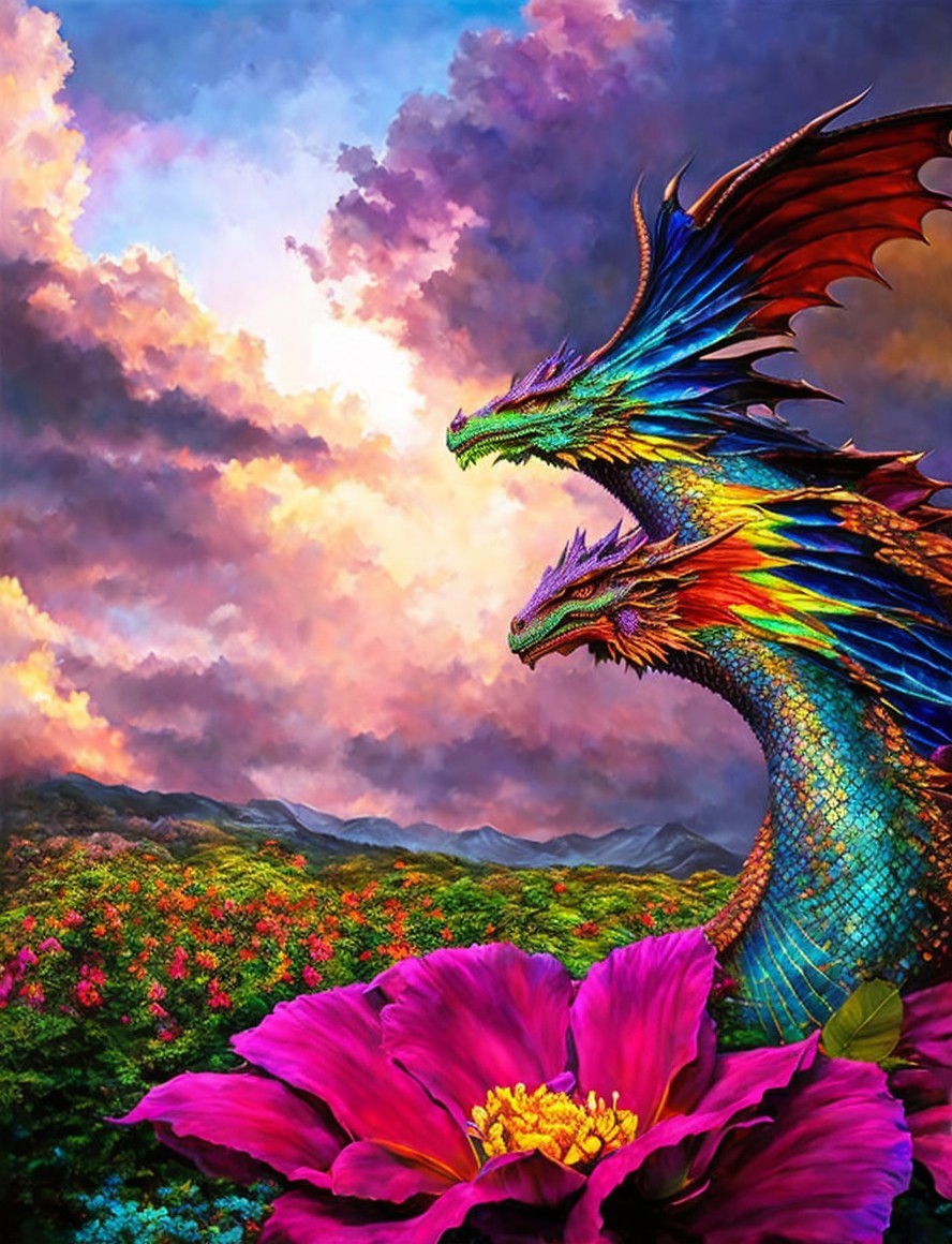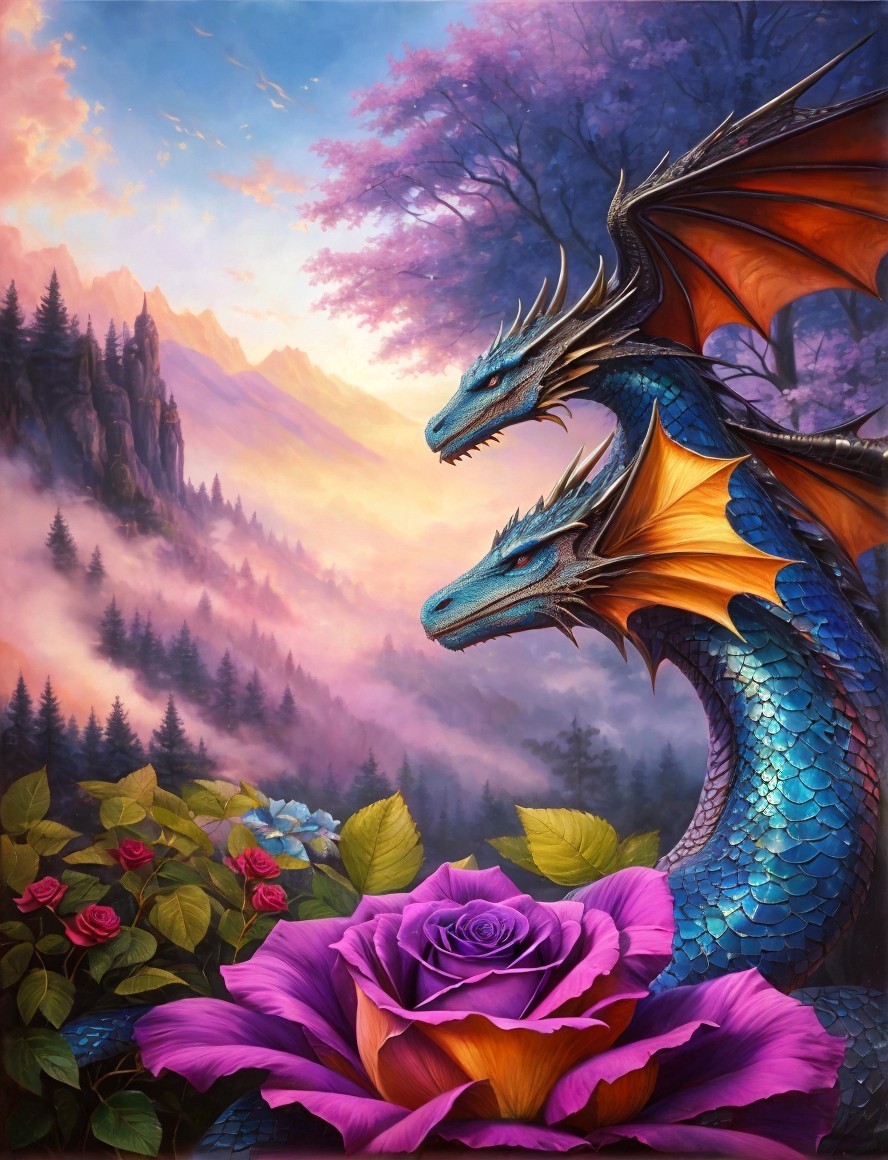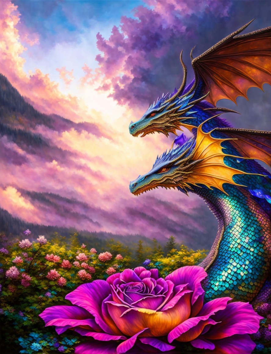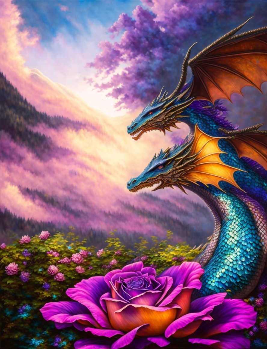 Colorful artwork: Two blue dragons with orange wings in pink clouds, roses, and mountains at dusk