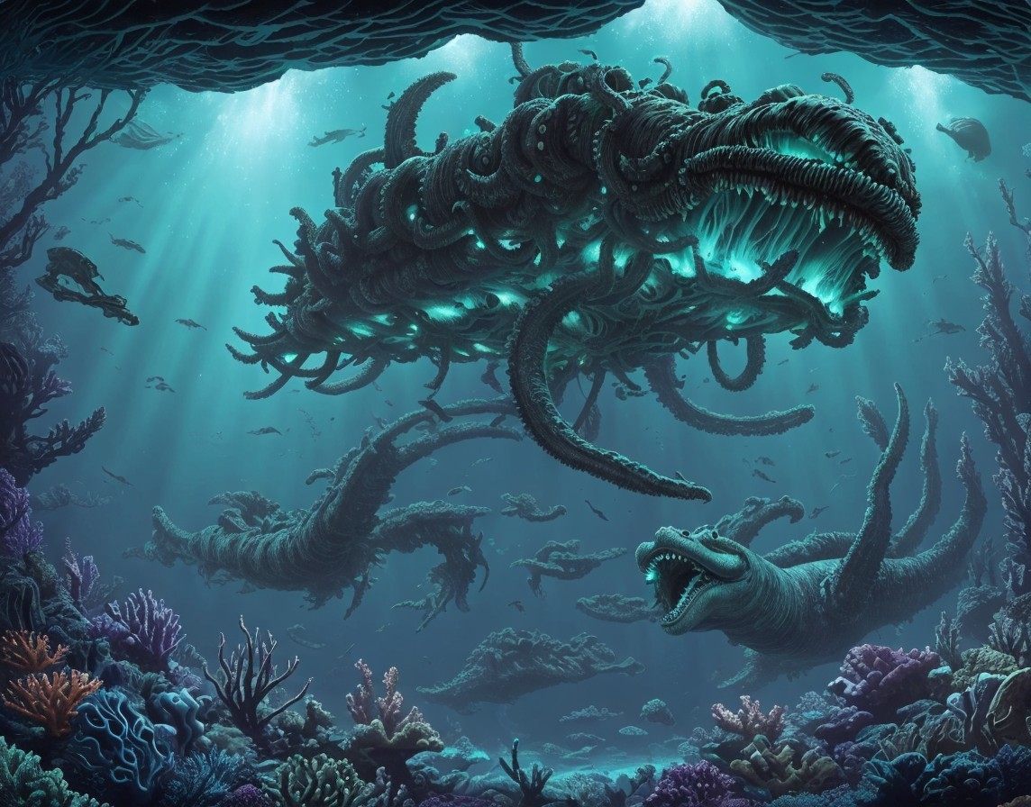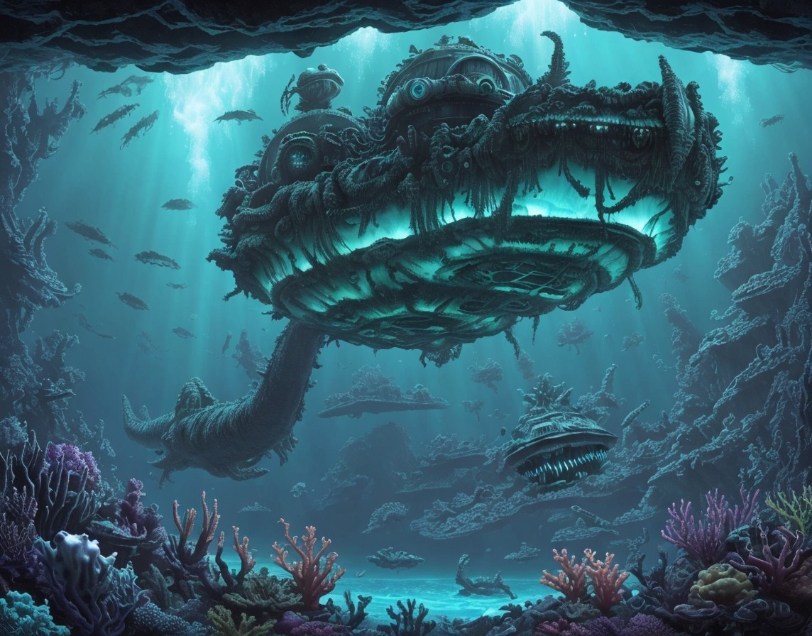 + Prompt:Underwater ship, USO, unidentified submerged object, Extraterrestrial sea monster assimilated with advanced alien technology in a deep-sea aquatic landscape. Dynamic landscape with massive ravines and a bioluminescent coral reef, statues of neptune, fish, squid and octopuses, large jagged phosphorescent crystals. Cthulu like sea monster with long tentacles and wings. sacred geometry, mystical, Realistic and natural elements, In the style of Cameron Gray