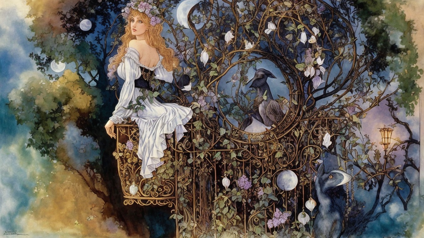 A serene woman adorned in white sits gracefully on a decorative ledge, surrounded by blooming flowers, butterflies, and gentle animals, bathed in soft moonlight and twilight hues.