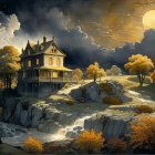 A picturesque scene features a grand, old mansion under a dramatic sky with two moons. Surrounded by vibrant autumn trees, the landscape exudes a mystical and inviting atmosphere.