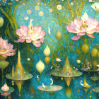 A serene, dreamy scene filled with vibrant blues and pinks. Majestic lotus flowers float on a tranquil pond, while graceful figures and elegant birds enhance the enchanting atmosphere.