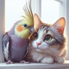 A charming scene featuring a playful cockatiel perched close to a fluffy, expressive cat. Soft sunlight filters through a window, highlighting their friendly interaction and vibrant colors.