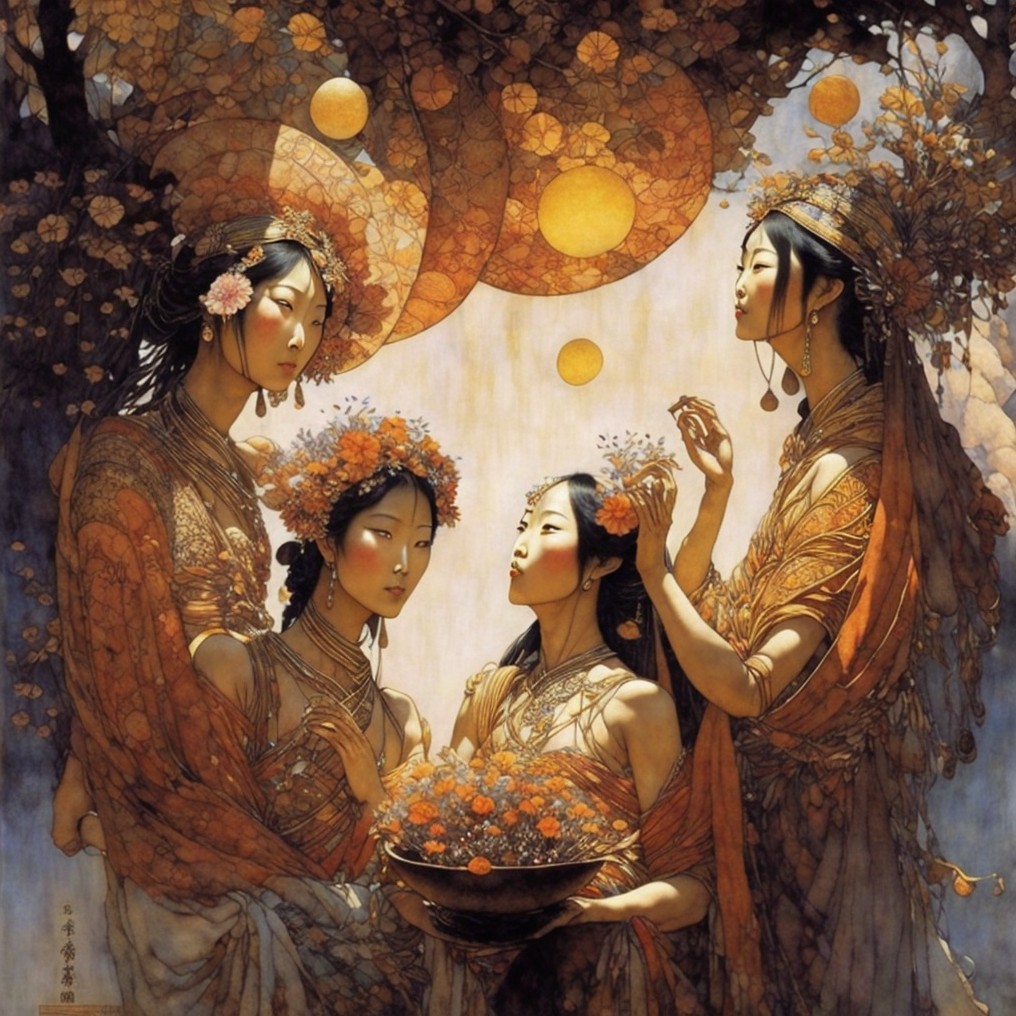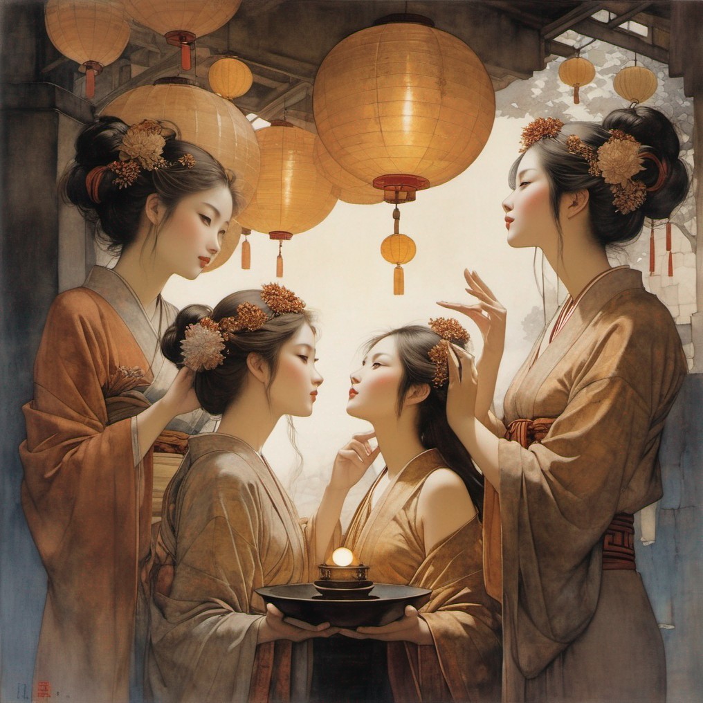 Four women in traditional Asian attire stand under lanterns, appearing to engage in an intimate conversation within an architectural setting.