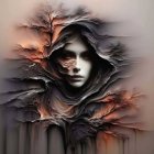 A striking portrait of a woman emerges from curled, textured layers resembling tree bark, with flowing hair blending into earthy tones. Her captivating gaze and delicate features evoke a surreal beauty.