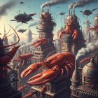 In a surreal cityscape, giant lobsters roam among futuristic skyscrapers, while airships hover in a sky filled with smoke and steam, blending marine life with a steampunk aesthetic.