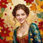 A young woman in a richly embroidered blue dress, adorned with gold details, stands amidst vibrant red and yellow flowers. The background features a radiant, spiraling design, enhancing her regal presence.