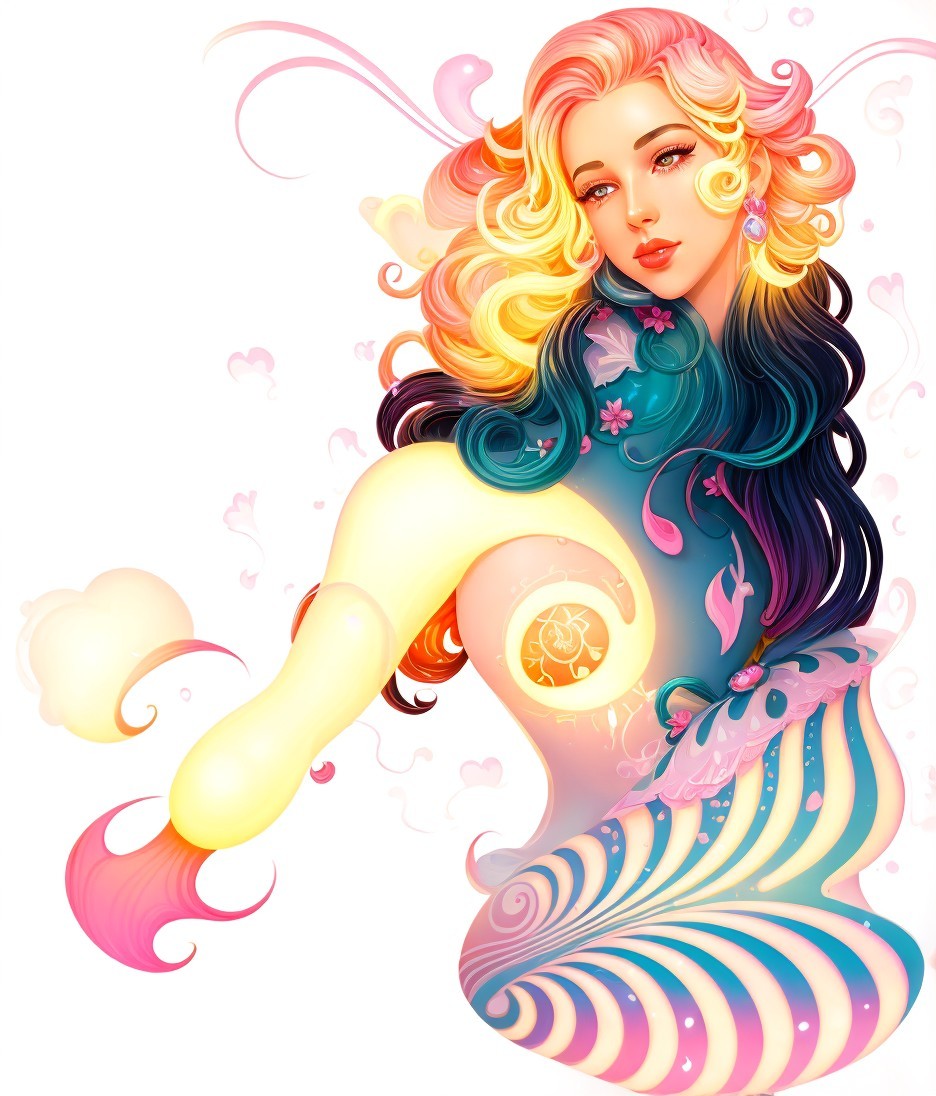 Art nouveau illustration of beautiful female made of candyfloss, purple rim lighting, ornamental bioluminescent glowing, fantastical elaborated kink, transparent white lines of symbiotic candyfloss ,style of 1940s advertising art, cadyfloss details, vibrant luminous red lighting, tints of splash art style, psychpomp surrounding, ornamental strokes, shiny spiritual expression, beautiful plushy psychpomp, delicate bottom lighting ,golden ratio, colorful embossed strokes, illustrative maximalism