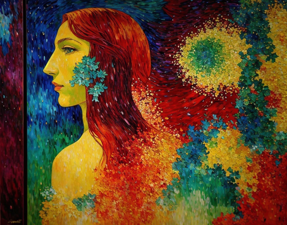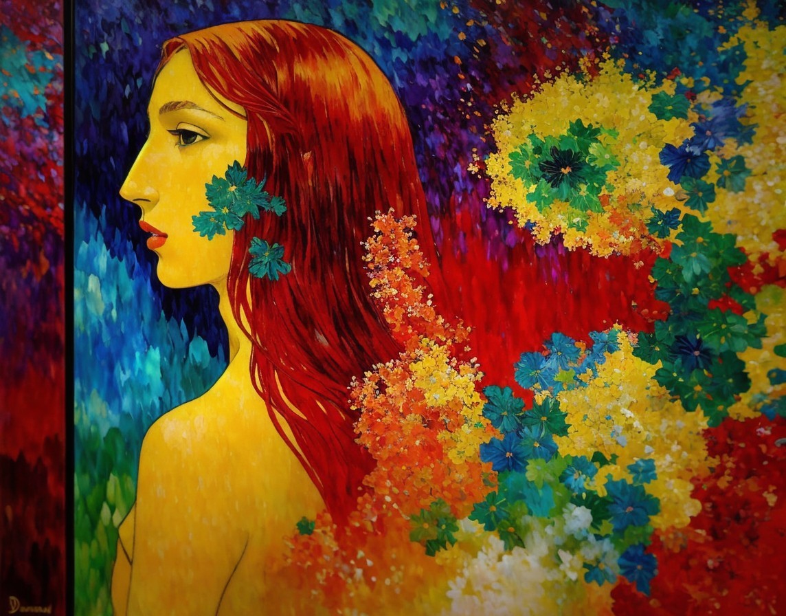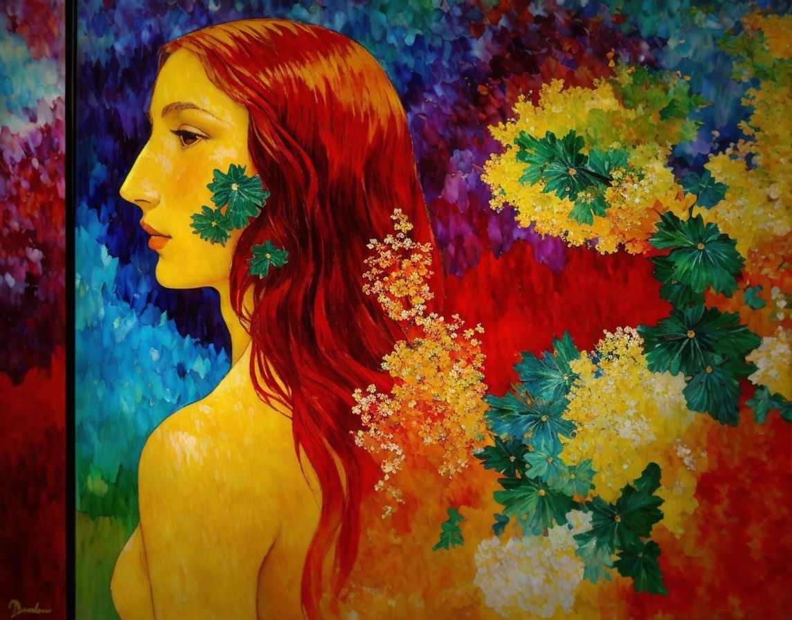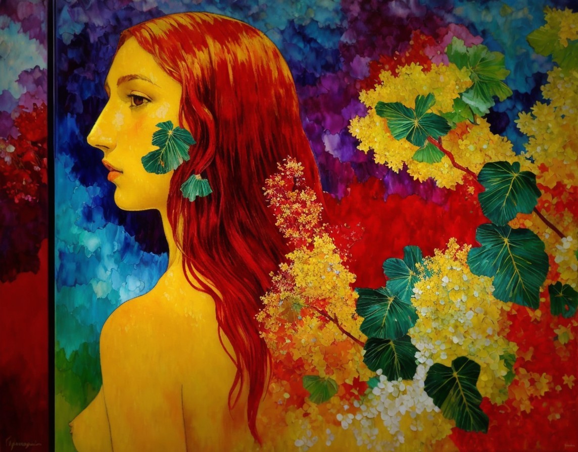 Colorful painting of red-haired woman with green leaves on vibrant floral backdrop