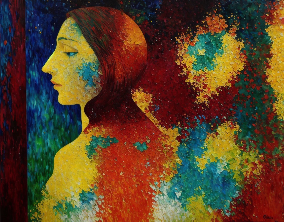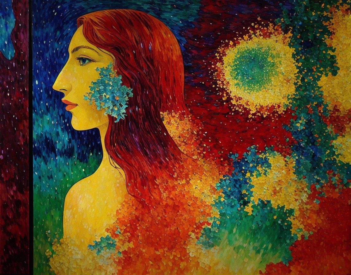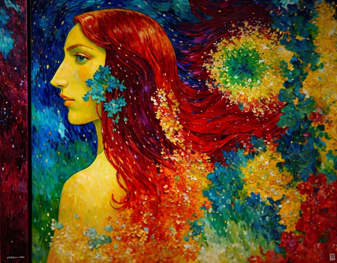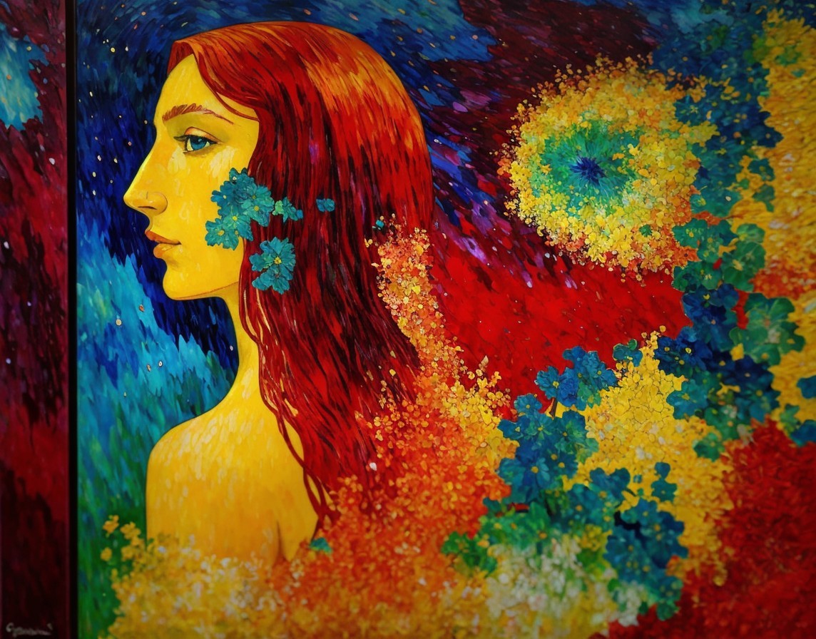 Colorful painting of red-haired woman with green leaves on vibrant floral backdrop