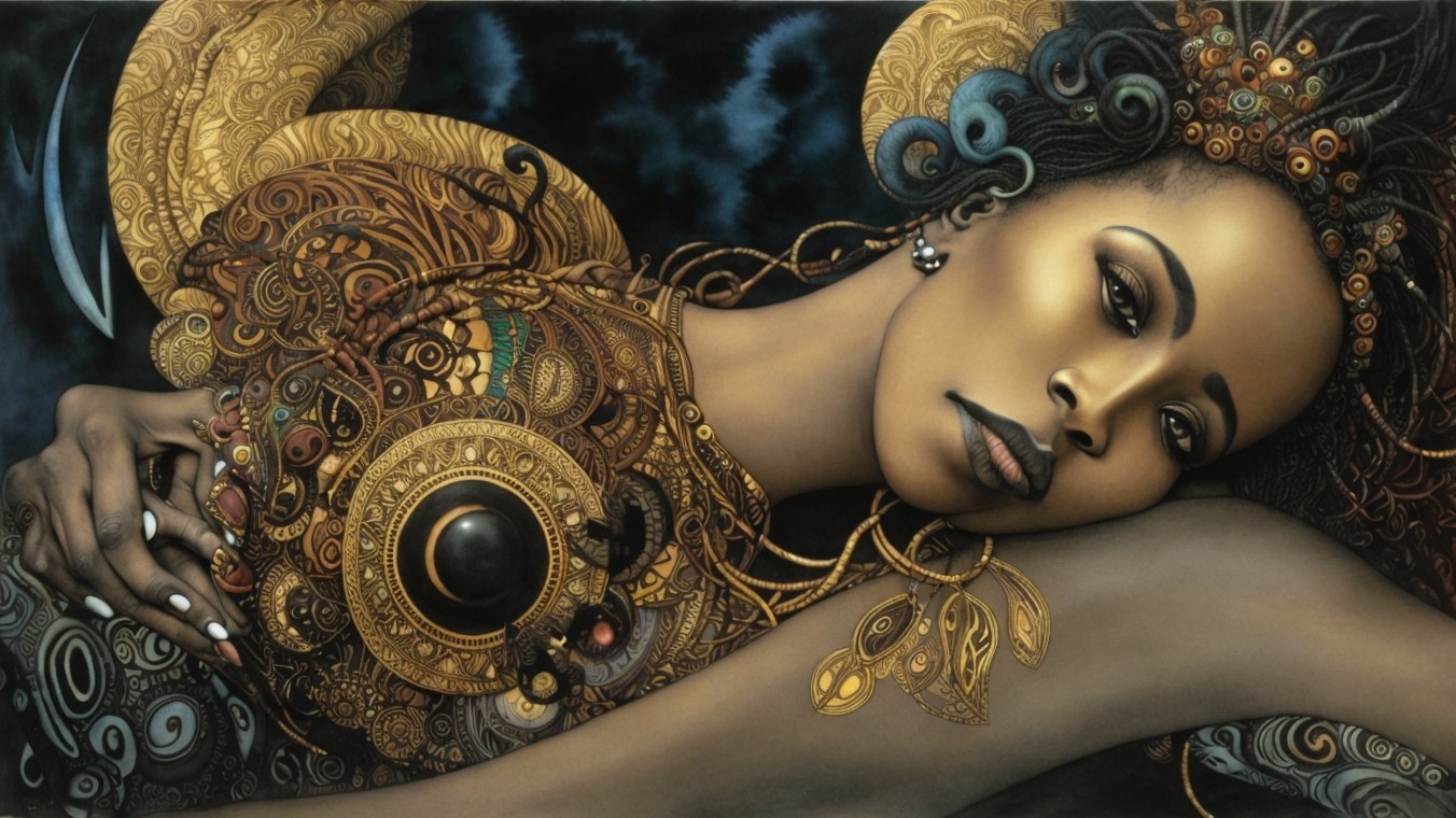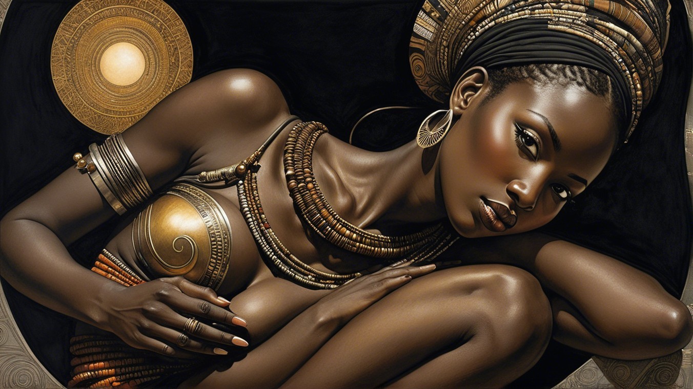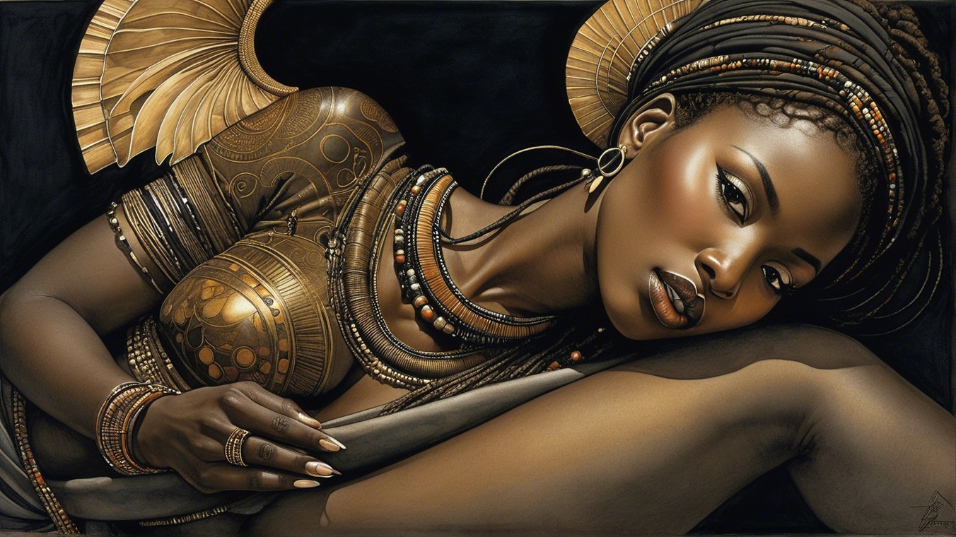 A stunning portrait of a woman adorned in intricate jewelry and traditional attire, showcasing rich textures and vibrant colors, all set against a dark, artistic background.