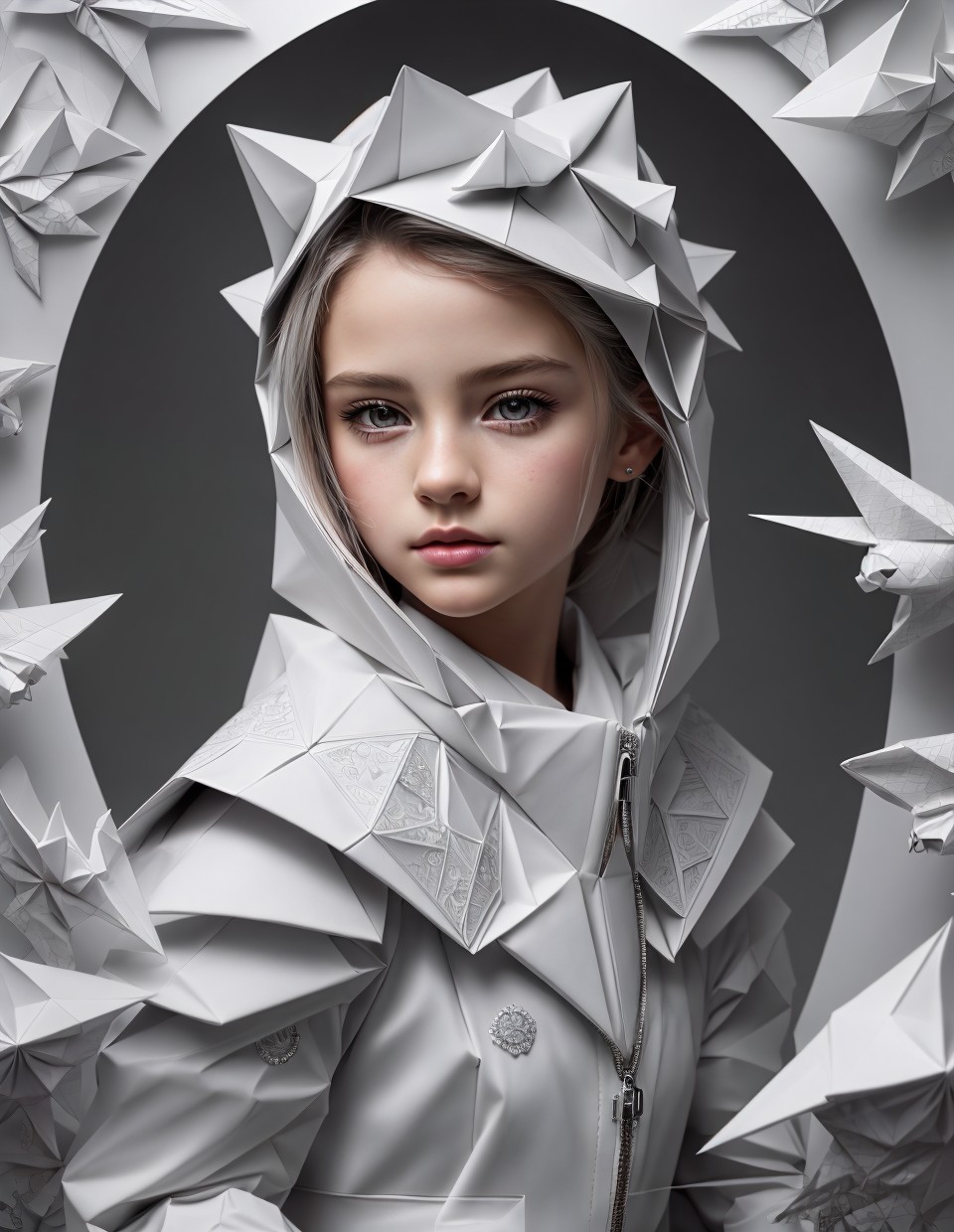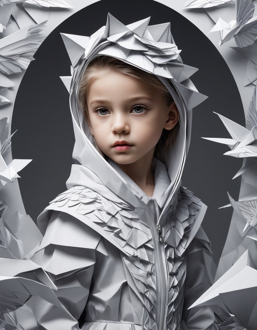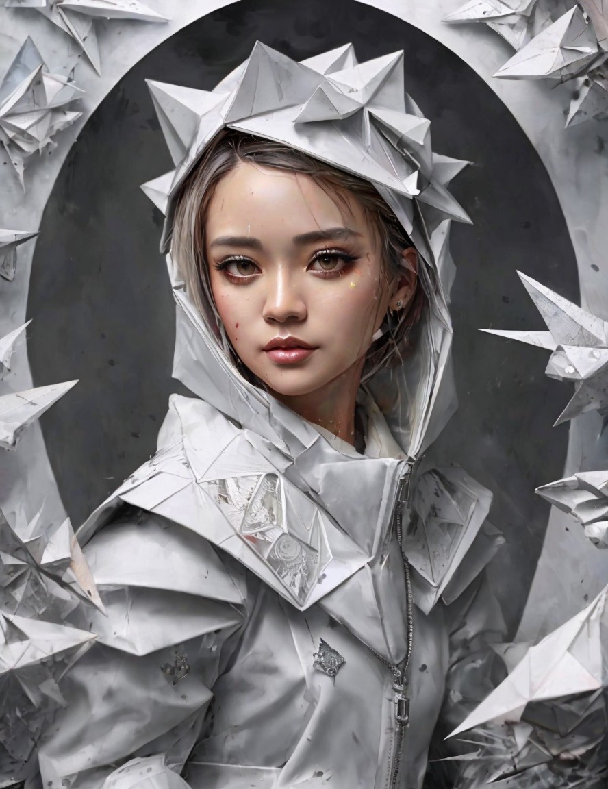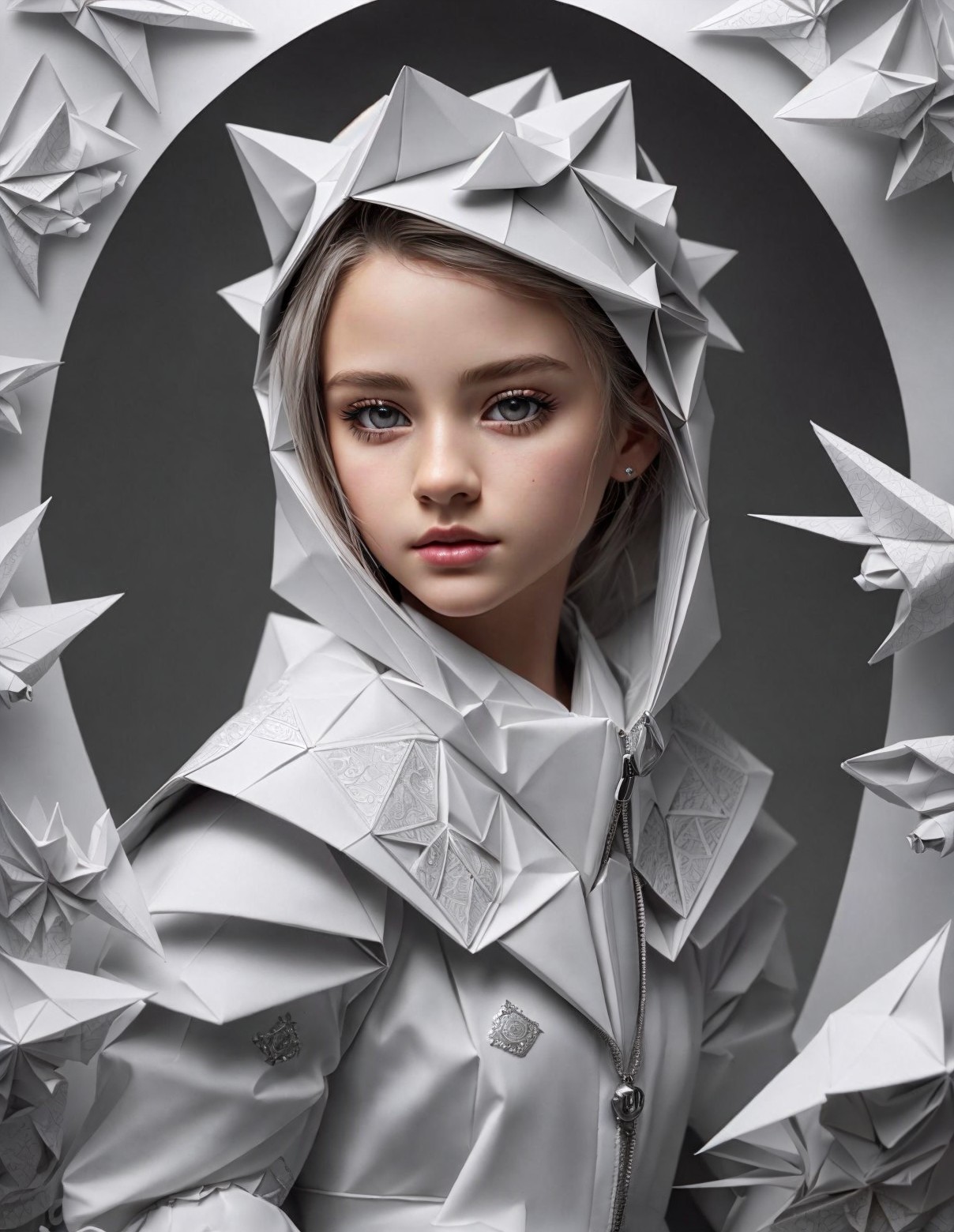 ("Try it" from other User) A woman with striking blue eyes wearing an intricate origami-inspired hooded outfit, surrounded by paper cranes.