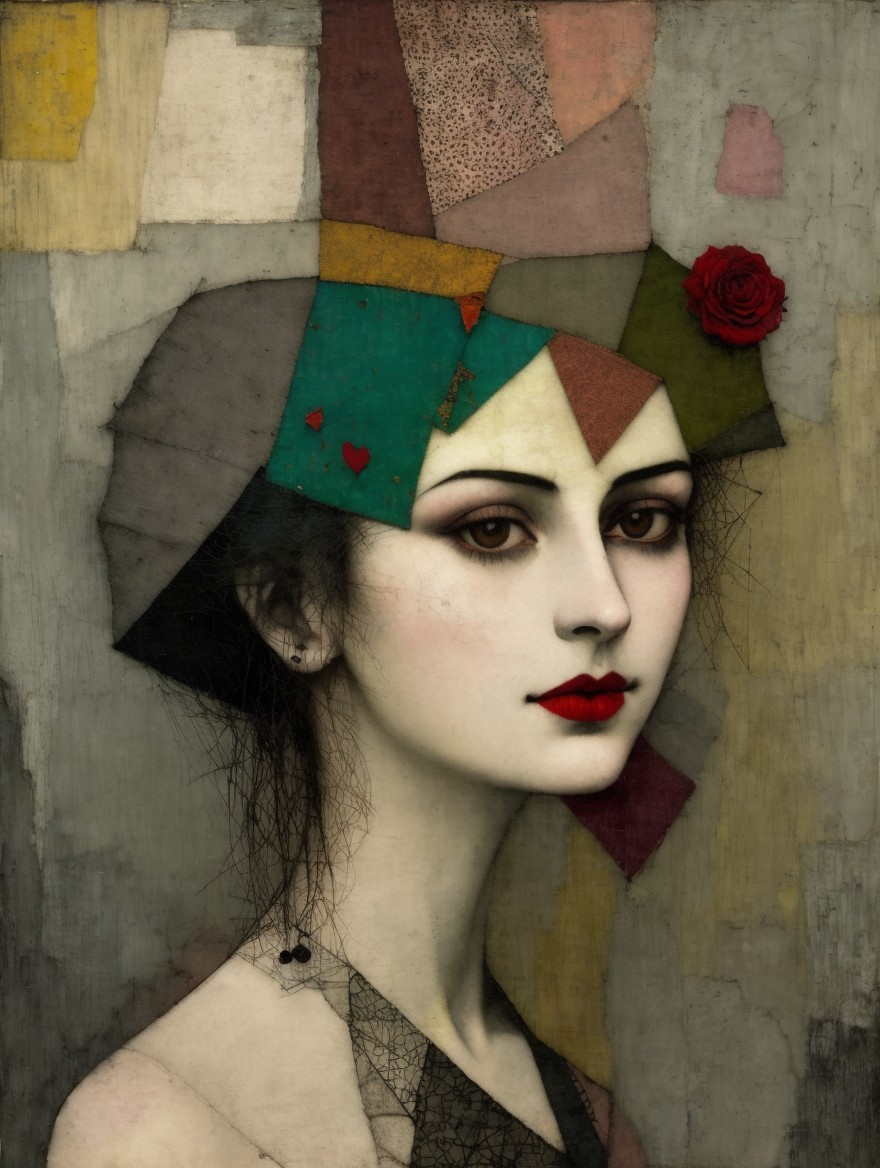 A woman with porcelain skin, red lips, and a cloche hat poses before a patchwork background.