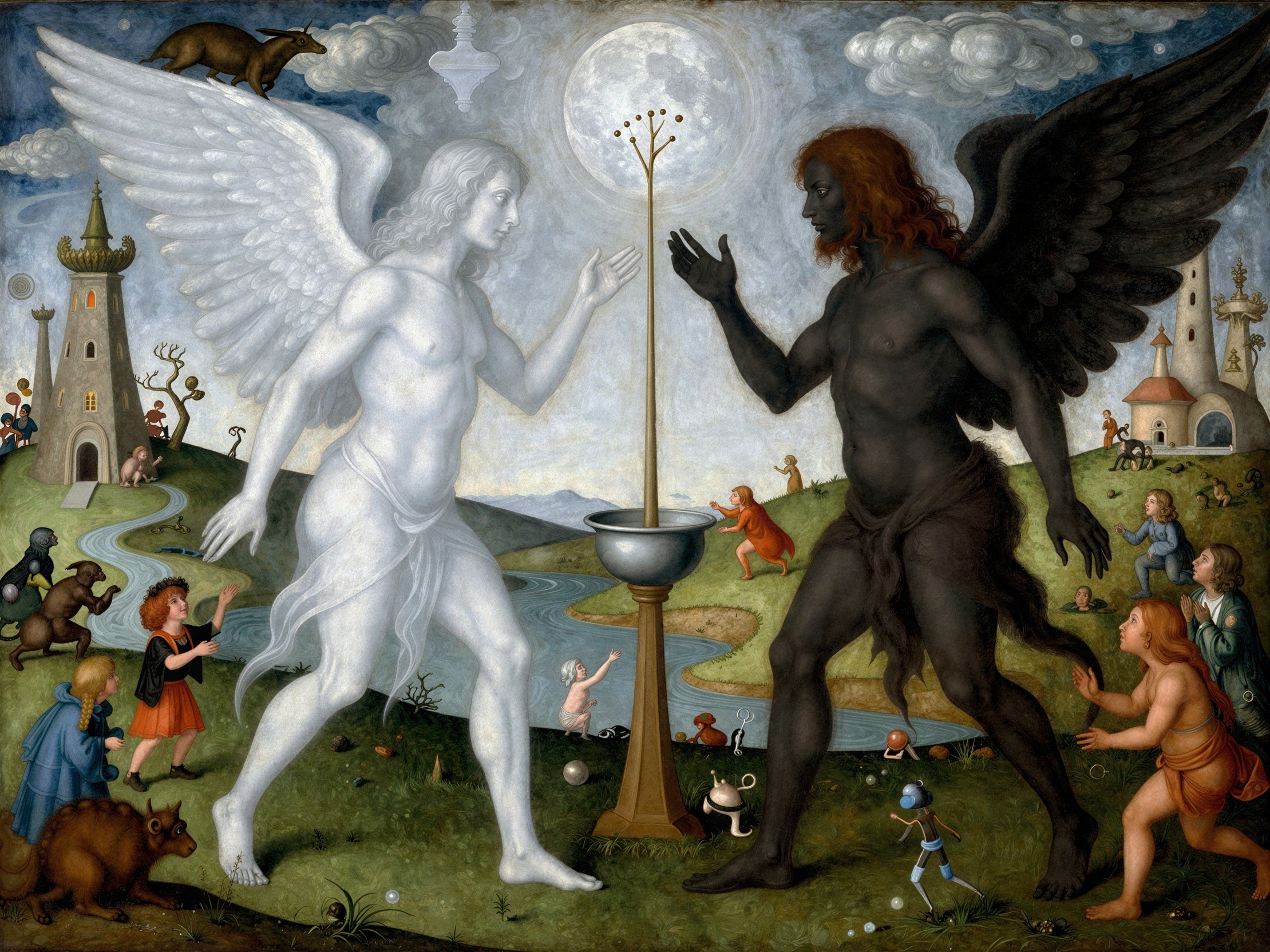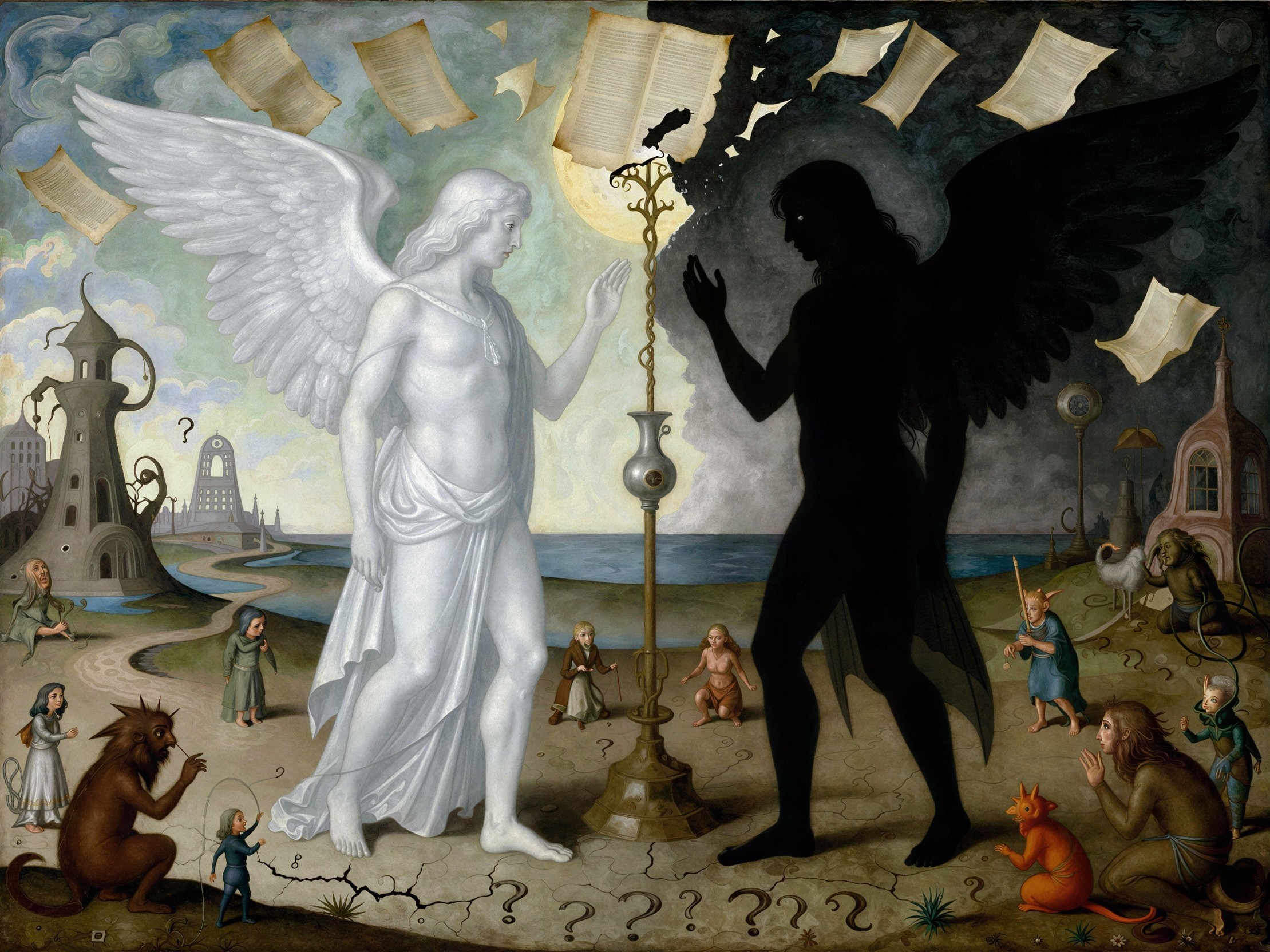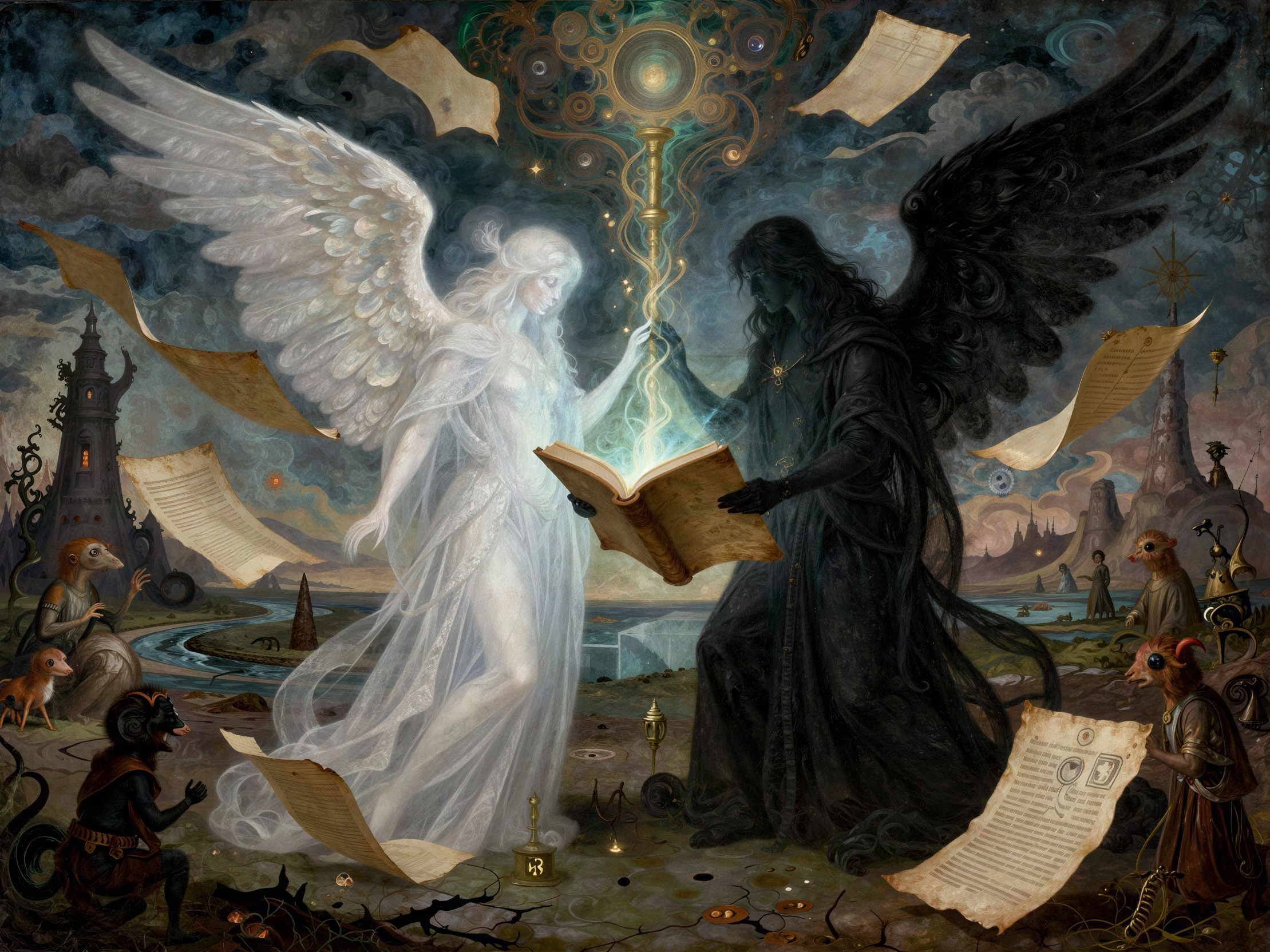 A highly detailed fantasy digital painting depicts a dark angel with large, feathery black wings and long dark hair, wearing a dark robe, looking down intently at a thick, glowing book open on her lap. Her hands are dark-skinned and gloved. Above her, a ghostly ethereal angel with white