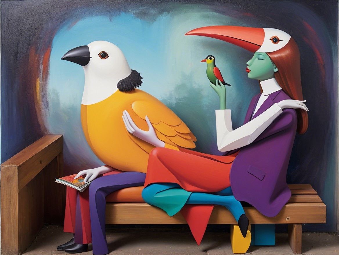 The image features a whimsical scene with a stylized woman with a bird-like face sitting next to a large, colorful bird. They sit on a bench against a vibrant, abstract background.
