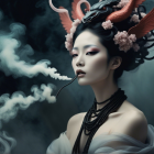 A striking portrait of a woman adorned with vibrant dragon motifs and floral accents, exuding an air of mystique, surrounded by wisps of smoke against a dark, ethereal background.