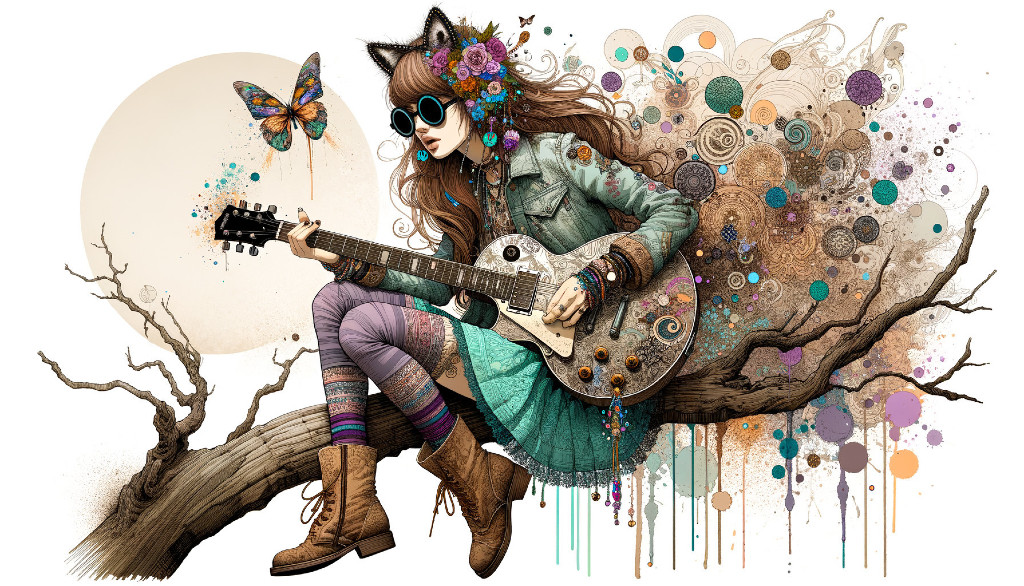 An intricate, vibrant aquarelle artwork featuring a cool girl with cat ears, playing an electric guitar in a whimsical fantasy setting. The illustration showcases a blend of retro, grungy, and boho styles with vivid colors and a heavenly aura.