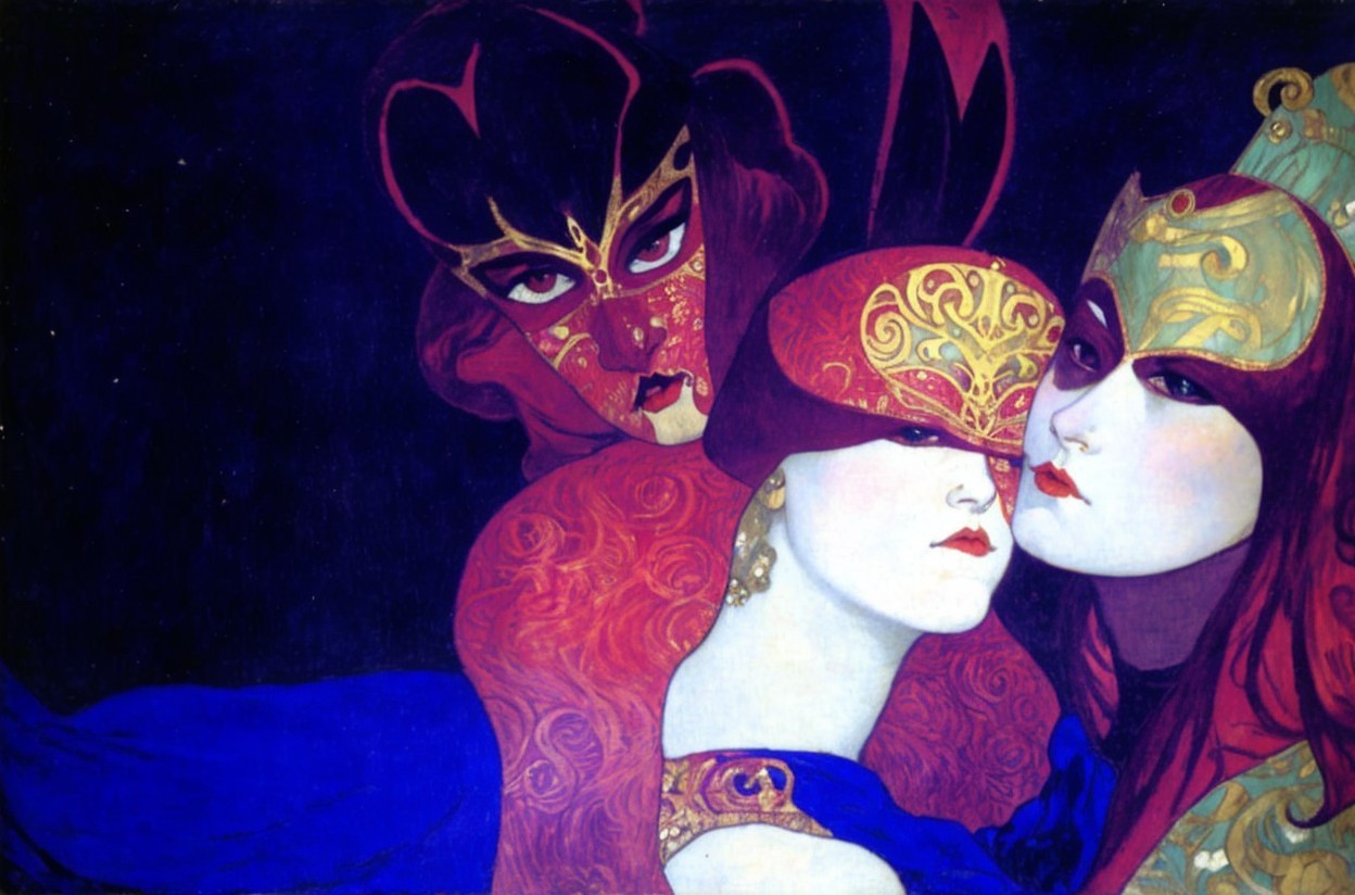 Three stylized figures with elaborate masks on deep blue backdrop, adorned with gold designs.