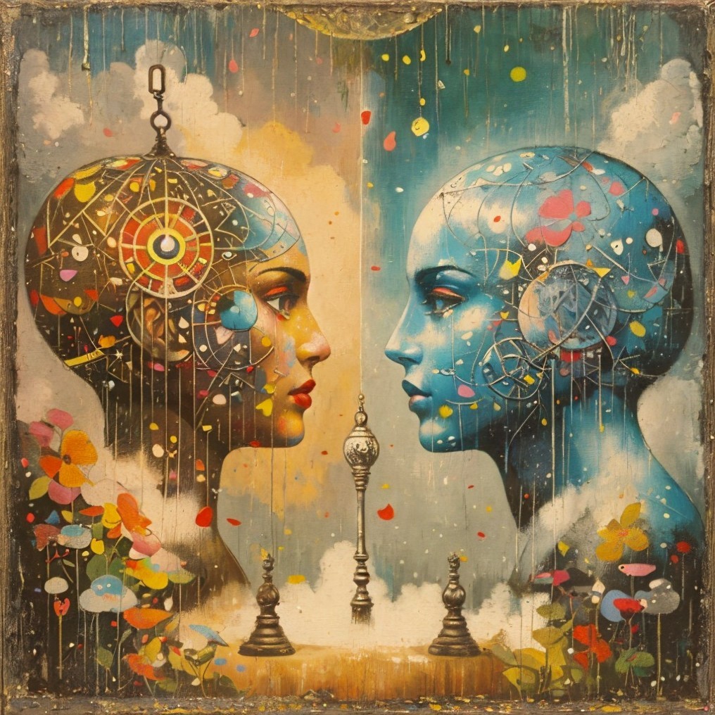 The artwork features two stylized, bald figures facing each other, one with a soft red hue and the other in a striking blue. Colorful splatters and a pendulum between them add vibrancy.