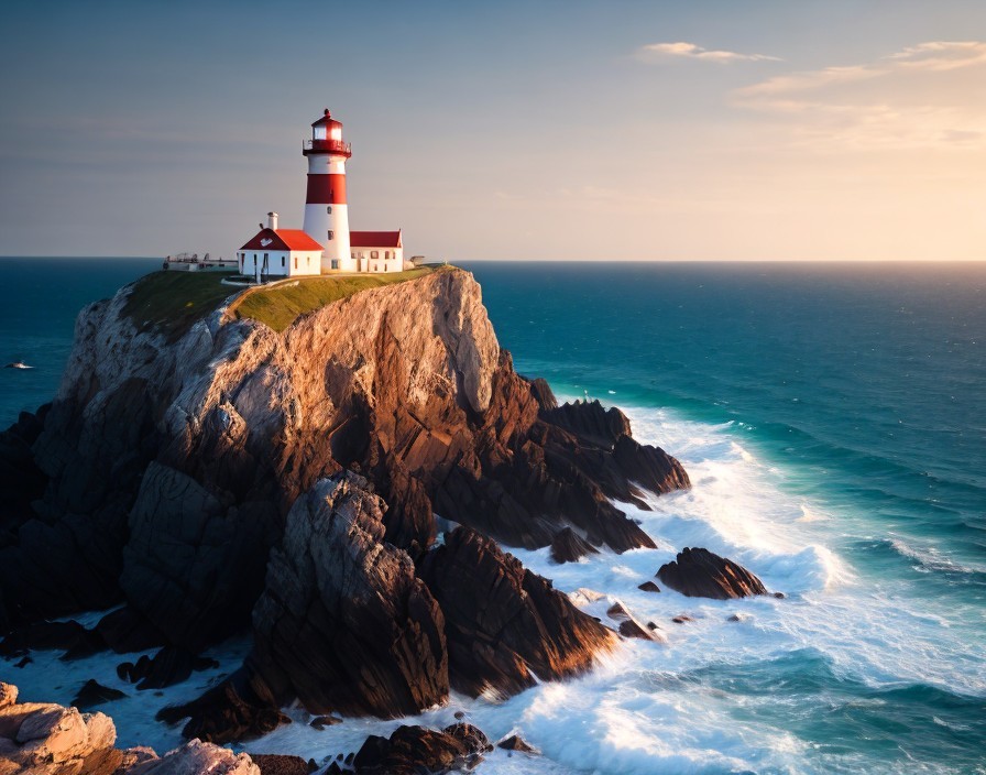 A serene lighthouse perched atop rugged cliffs against a backdrop of the calm, blue ocean and a clear sky at sunset.