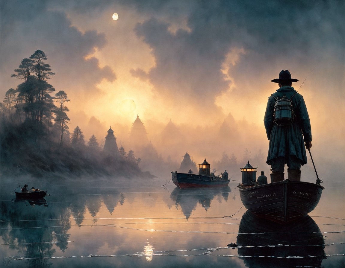 Image of a fisherman in a boat at dusk, one lantern at the front of each boat, silhouette of landscape in dark background, Jean-Baptiste Monge, watercolor ink, intricate details, fantasy, beautiful, award winning, fantastic view, crisp quality, Peter Gric, Ivan Shishkin, moon rays in the mist, light reflections, deep colous, volumetric lighting, polished, masterful surrealism, cel-shaded, high definition