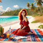 A young woman with vibrant red hair sits on a colorful blanket on a beach. Surrounded by palm trees, she enjoys a tropical drink and fresh fruit, with the ocean shimmering in the background.