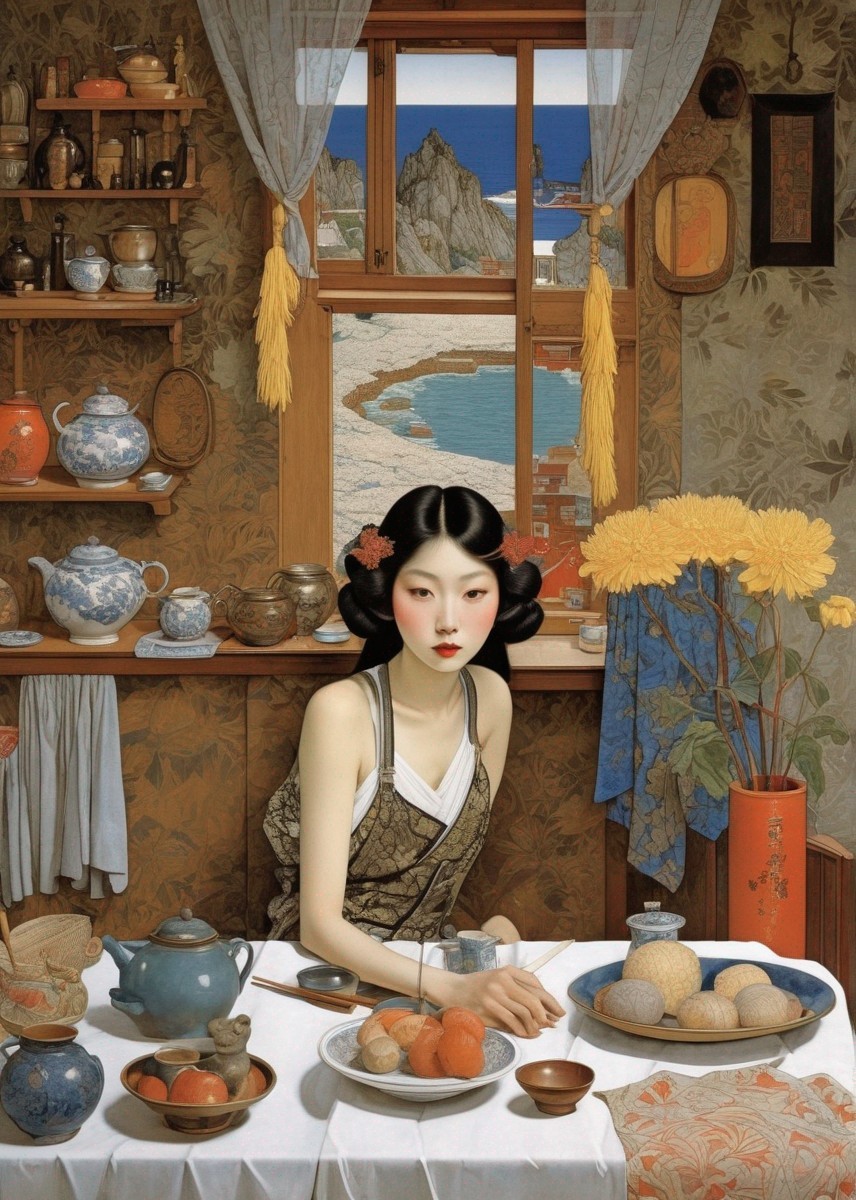 A woman in traditional attire sits at a table with fruit, in a room with a view of the sea and antiquities.