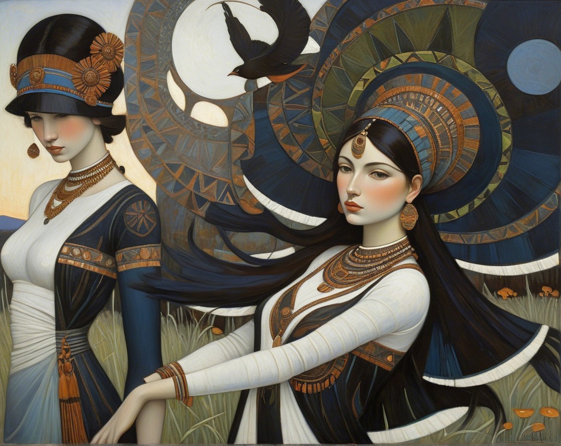 The image features four elegantly dressed women in rich blue and white attire, adorned with jewelry. They stand confidently against a backdrop of a stylized, intricate tree design.