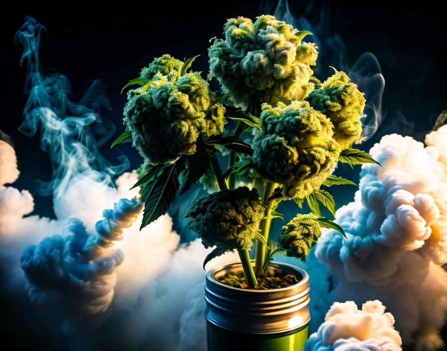 A potted plant with exaggerated, fluffy green growths surrounded by swirling blue smoke against a dark background.