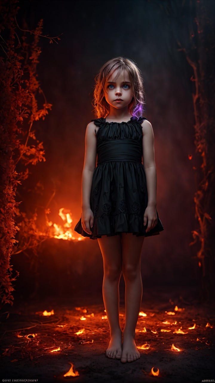 A young girl stands in a dark, fiery setting, wearing a black dress. Her expression is intense and haunting, contrasting with the surrounding flames and glowing embers.