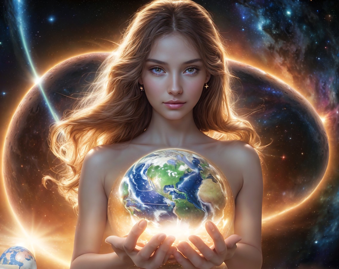 A beautiful star Maiden holding an earth globe in her hands against the background of a shining universe in the swirls of galaxies, award winning, clearly drawn hands, clearly worked out details, high definition, ultra-clear image, ultra-confusing, ultra-pronounced detail