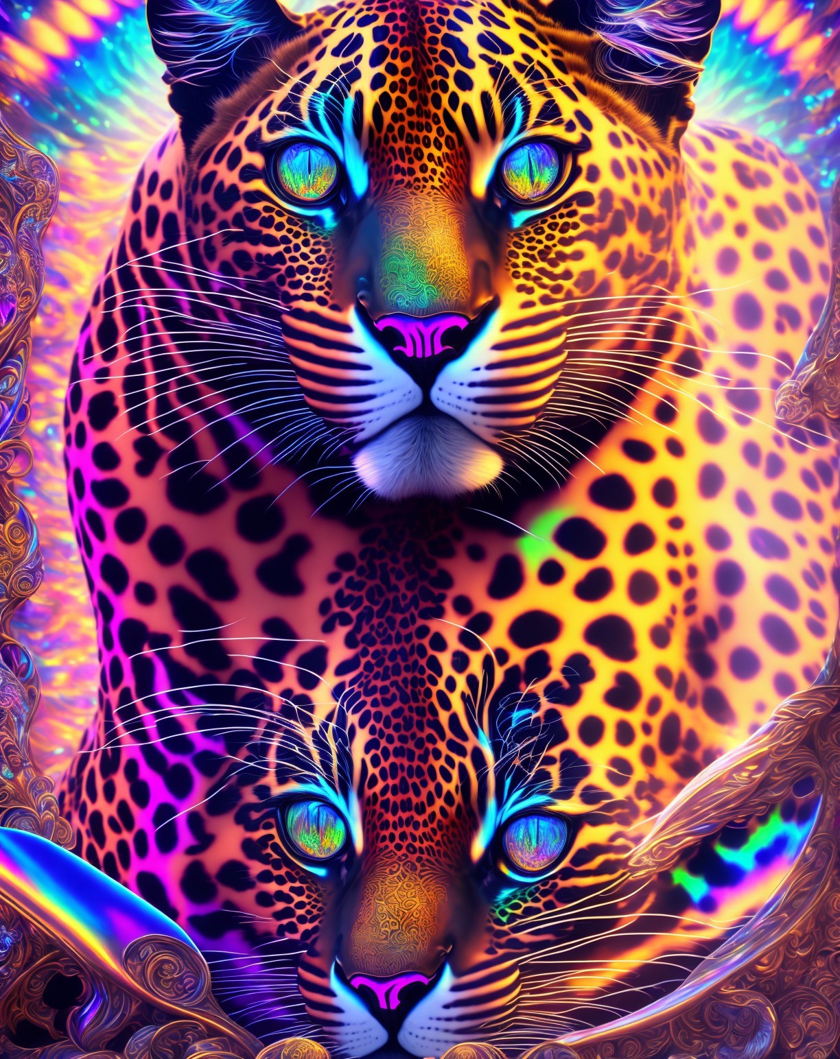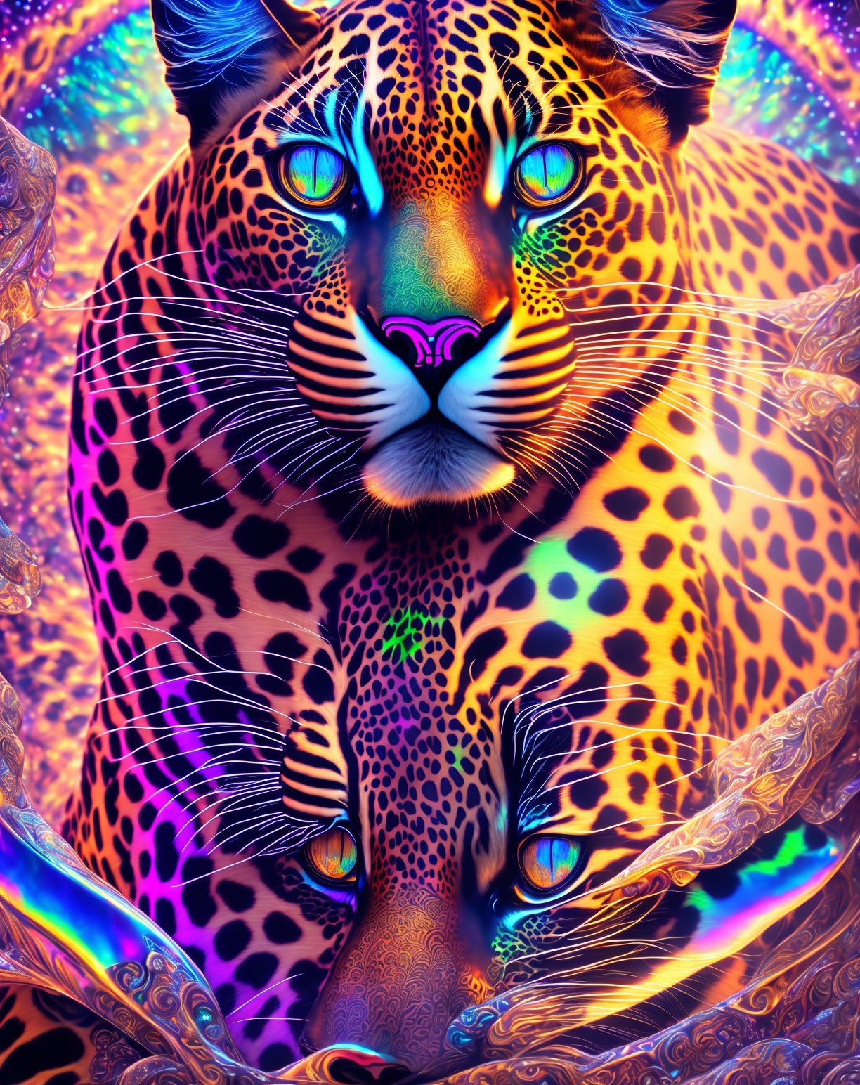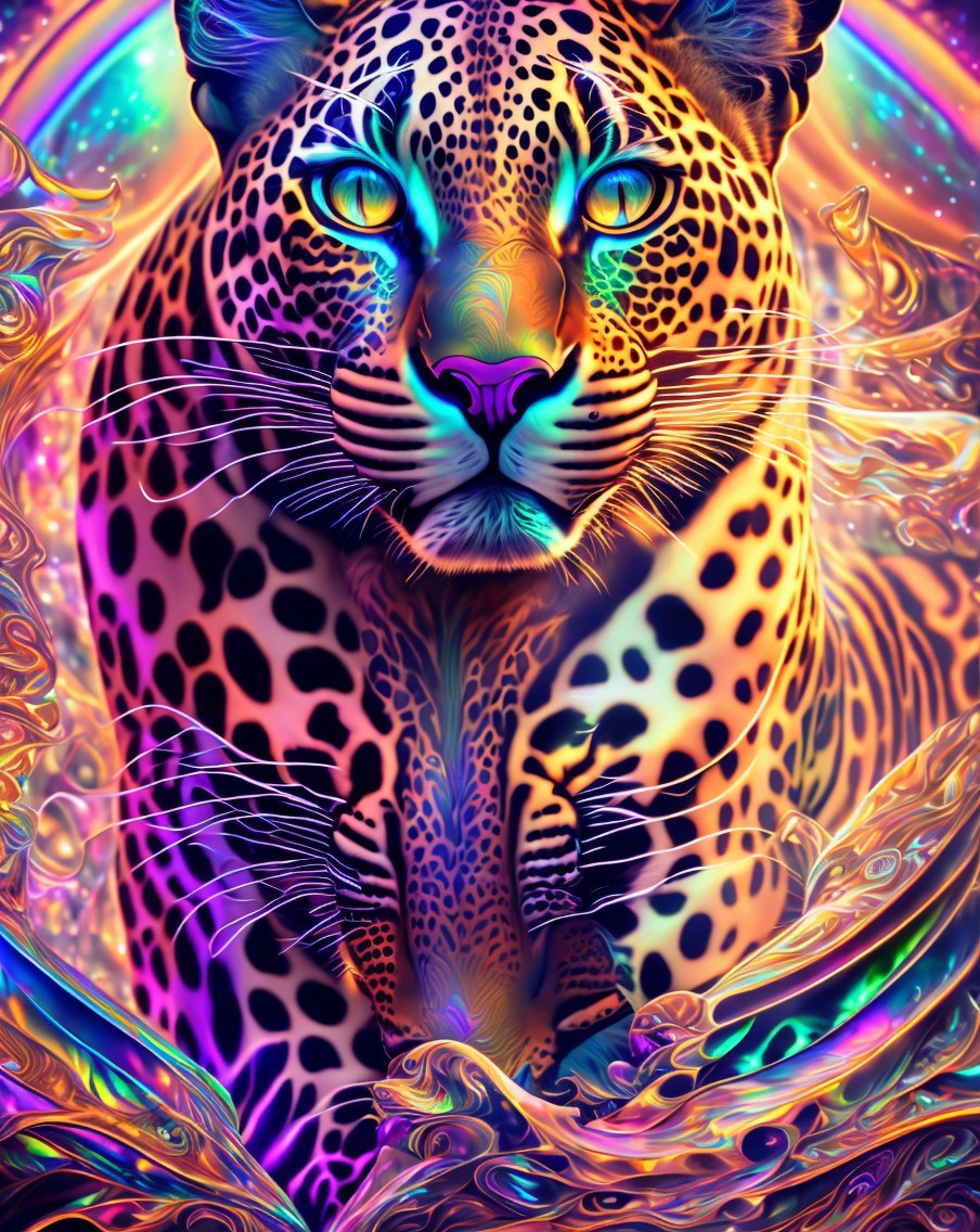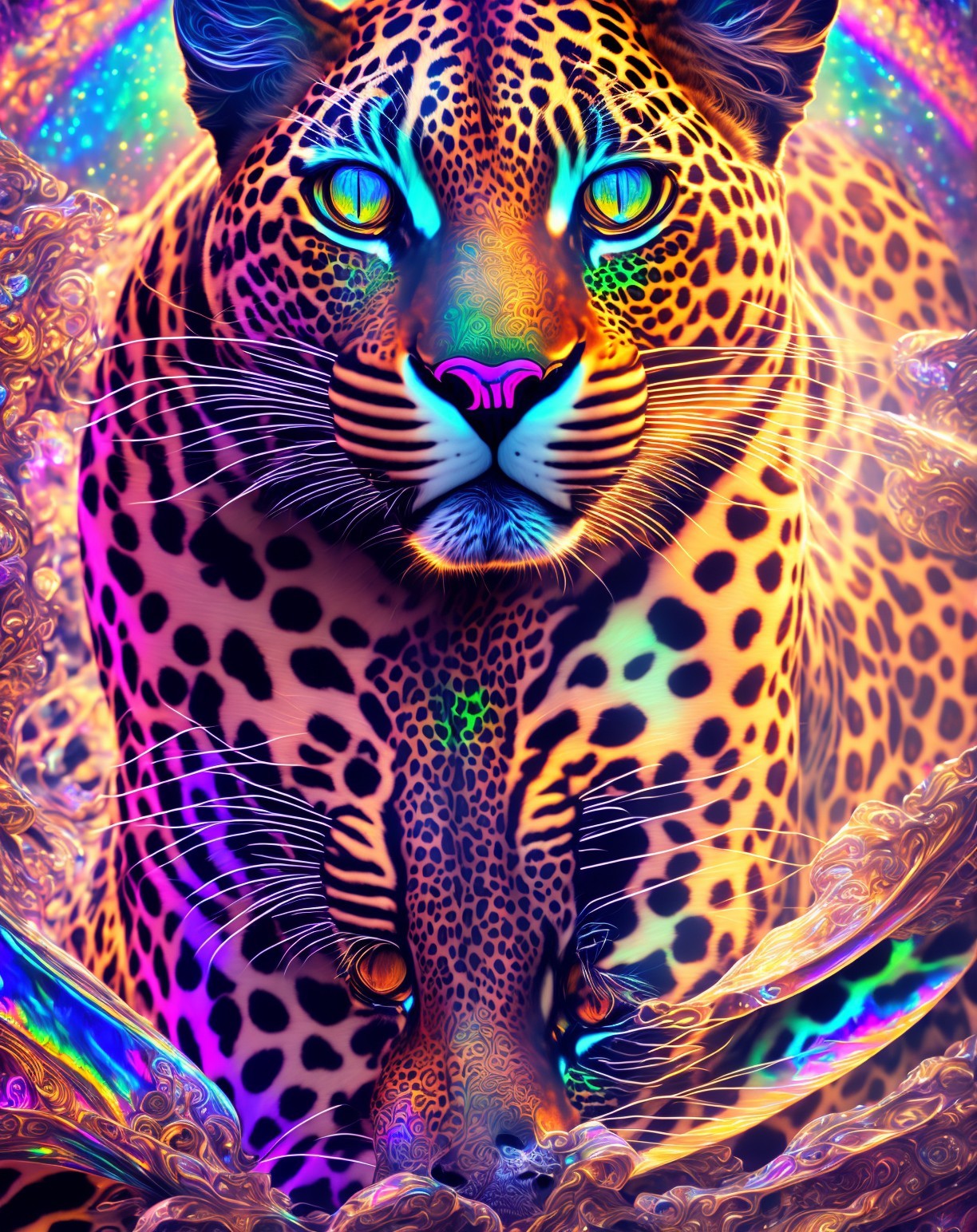+ Prompt:3D dynamic thick contrasted shadows. Intense Oled lights. In the style of Alex Grey, Mucha, Robert Williams and Cameron Gray, insanely Iridescent most fierce and powerful irresistible Leopard using a washing machine to travel space. Lots of waves of speed, energy, insanely psychedelic. Smoke diste splat effects. It's ascending to cosmic psychedelic zen skies from outer space skies. Insanely intricate details 8k. Flawless perfect