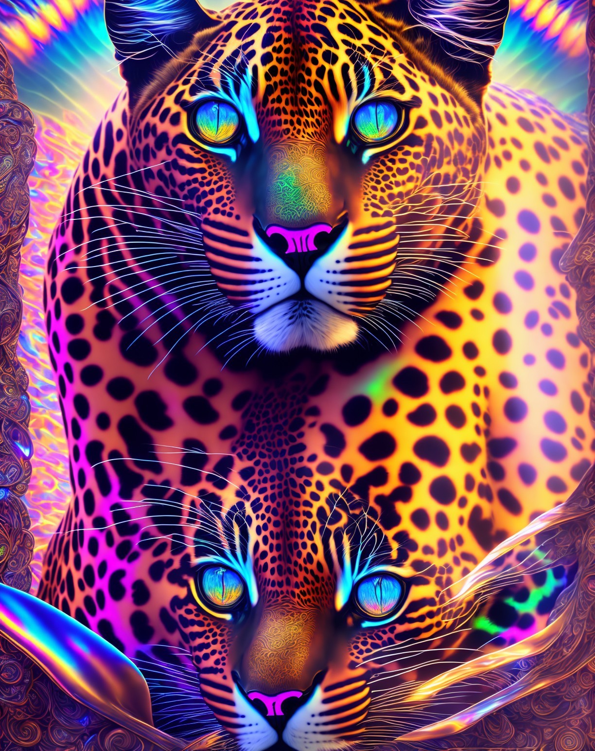 Coherent 3D dynamic thick contrasted shadows. Intense Oled lights. In the style of Alex Grey, Mucha, Robert Williams and Cameron Gray, ultra detailed insanely Iridescent most fierce and powerful irresistible Leopard using a washing machine to travel space. Lots of waves of speed, energy, insanely psychedelic. Smoke diste splat effects. It's ascending to cosmic psychedelic zen skies from outer space skies. Insanely intricate details 8k. Flawless perfect
