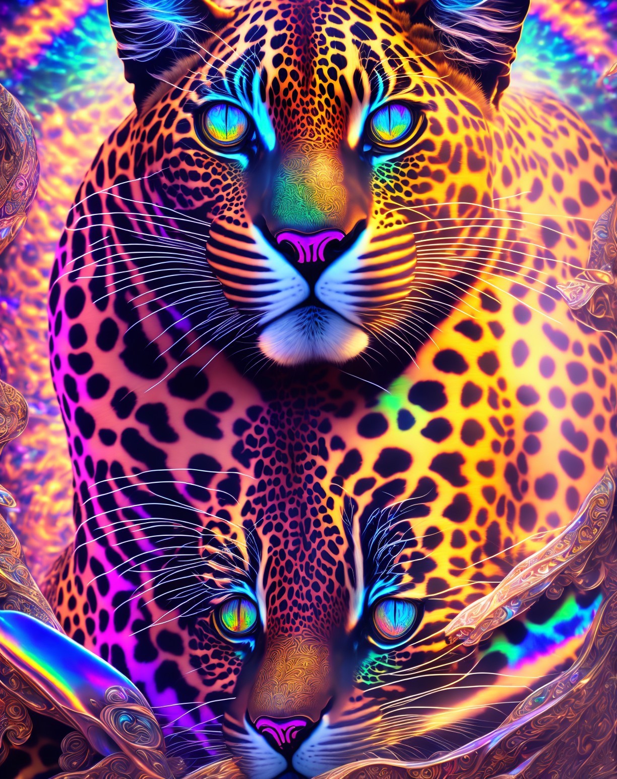 Prompt: Coherent 3D dynamic thick contrasted shadows. Intense Oled lights. In the style of Alex Grey, Mucha, Robert Williams and Cameron Gray, ultra detailed insanely Iridescent most fierce and powerful irresistible Leopard using a washing machine to travel space. Lots of waves of speed, energy, insanely psychedelic. Smoke diste splat effects. It's ascending to cosmic psychedelic zen skies from outer space skies. Insanely intricate details 8k. Flawless perfect