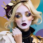 A moody, atmospheric scene features a stunning woman in a fur coat with striking red lips, gazing thoughtfully as a figure approaches through a rainy, dimly lit street lined with lampposts.