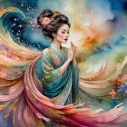 A surreal, dreamlike scene featuring ethereal figures surrounded by vibrant flowers and whimsical creatures. Soft colors blend harmoniously, creating a mystical, enchanting atmosphere.