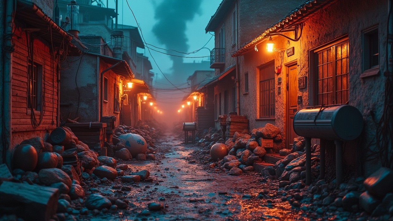 A narrow, dimly lit alleyway lined with rustic wooden shacks and old crates. Warm lights illuminate scattered artifacts, creating an inviting yet mysterious atmosphere under a twilight sky.