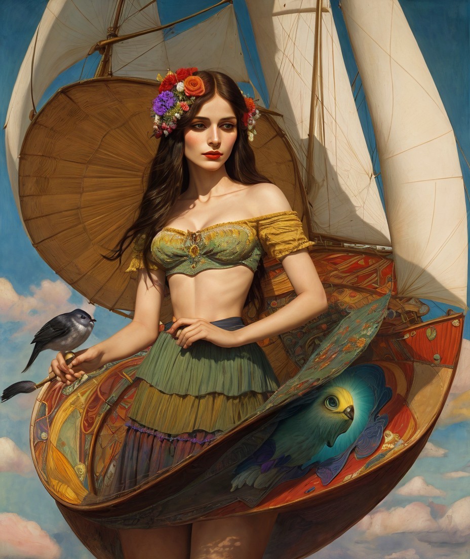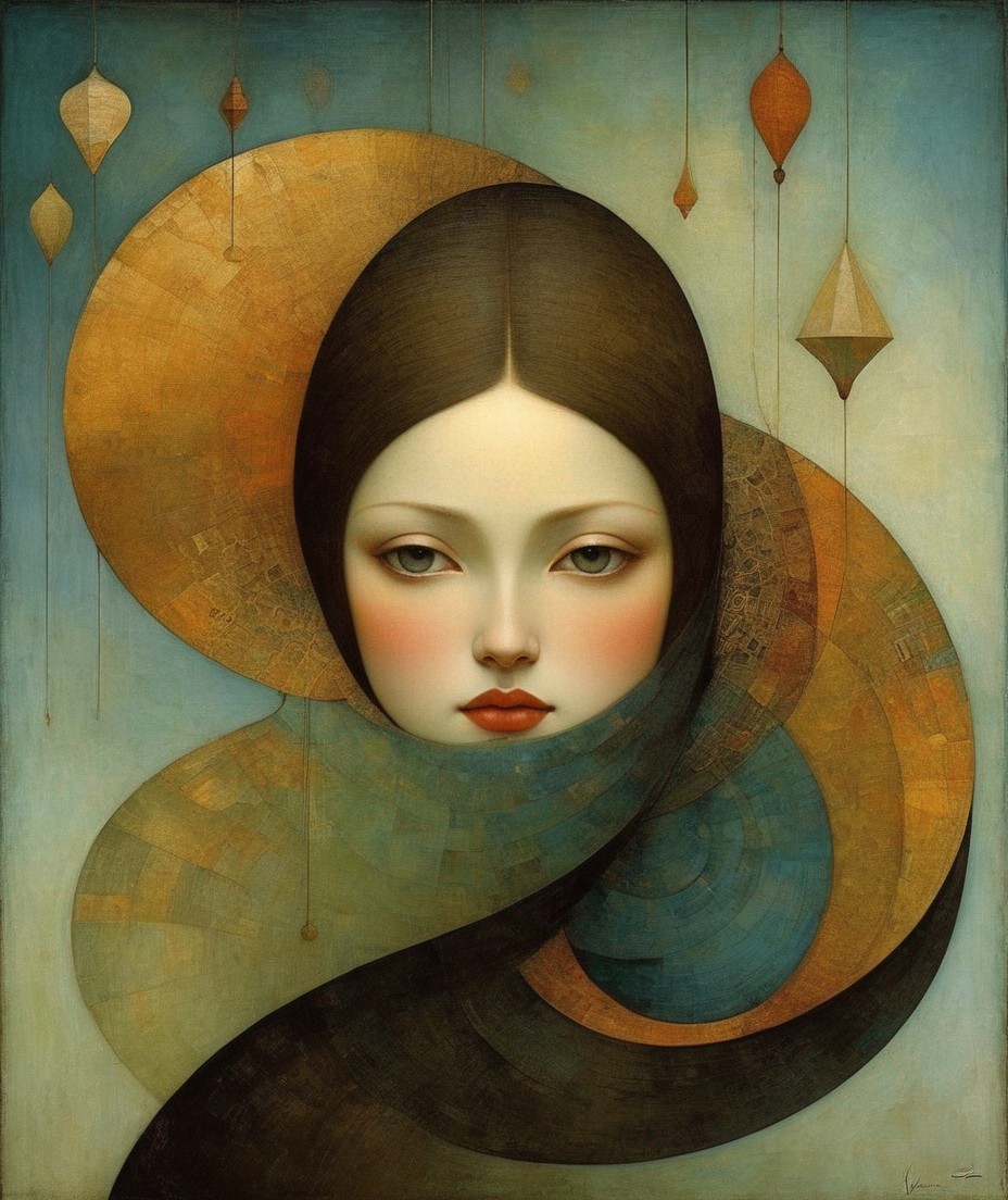 A woman in a headscarf faces left as a fox gently touches her lips with its nose against a celestial backdrop.