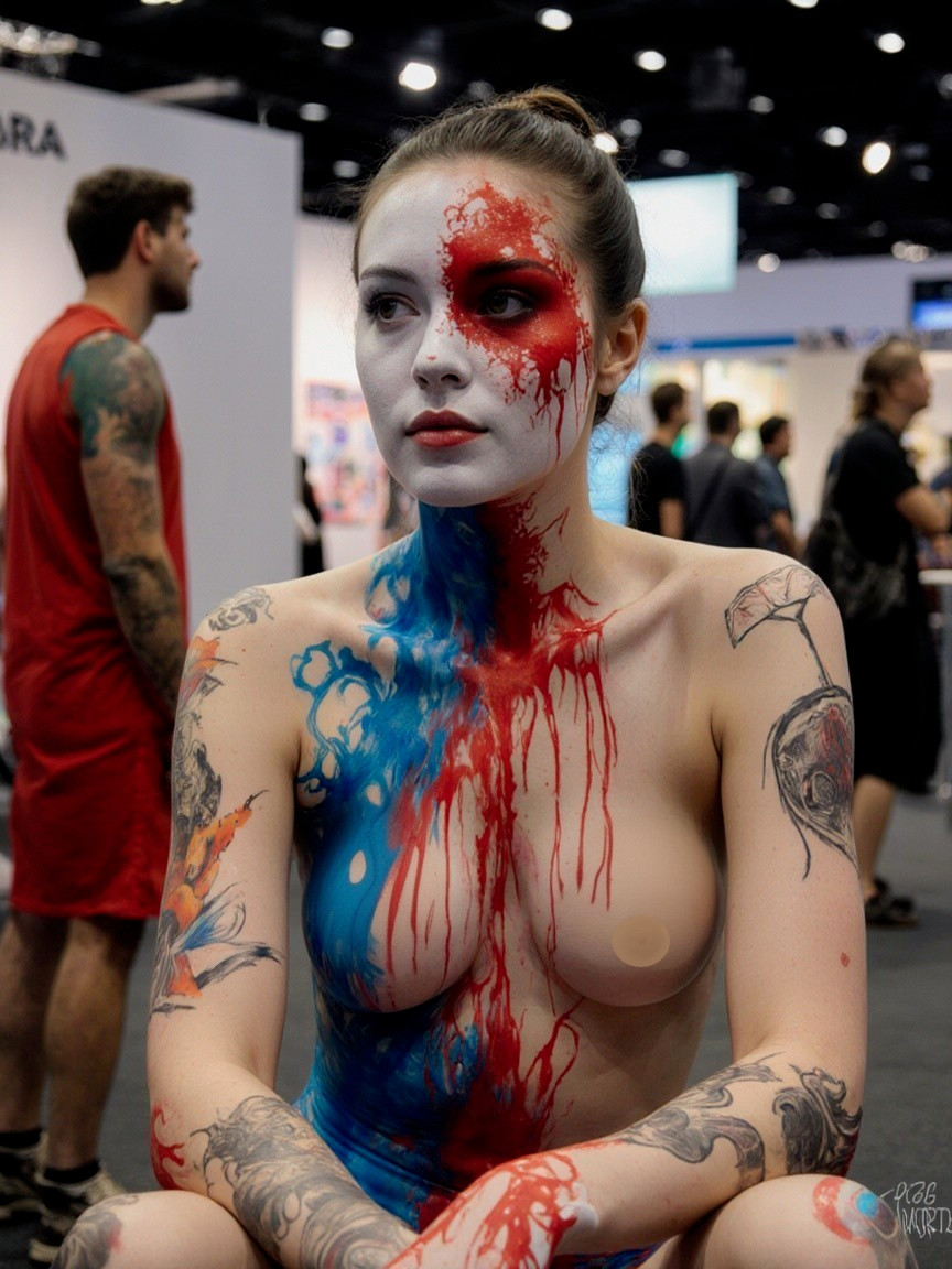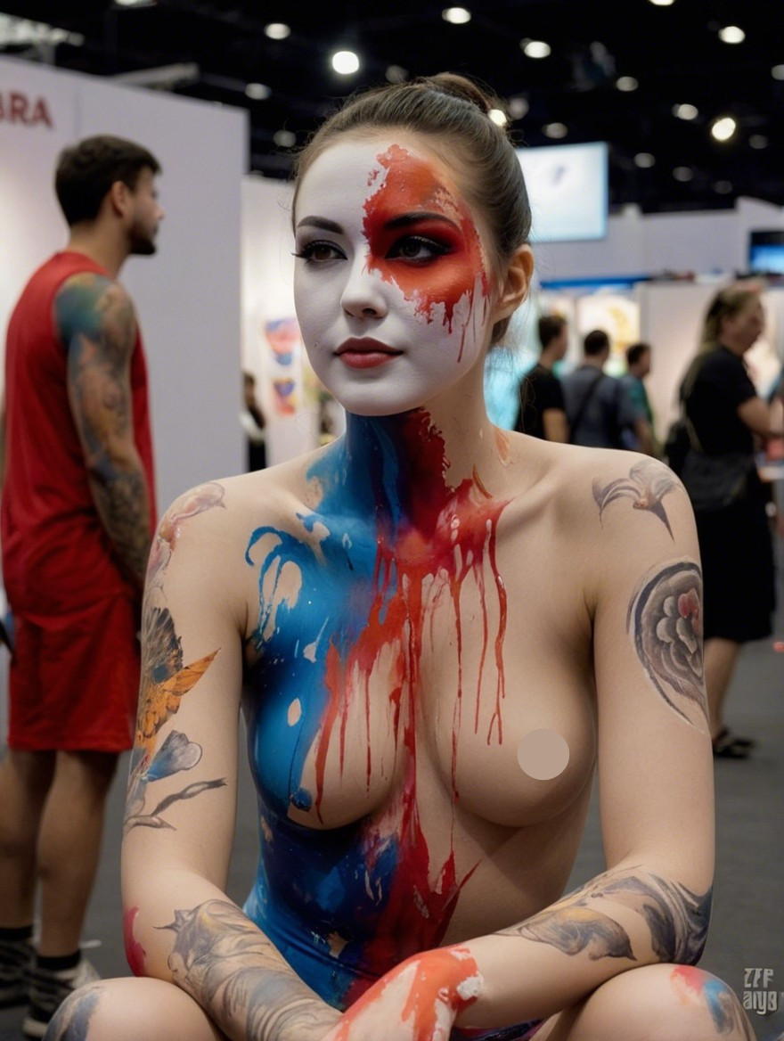 The image features a woman with striking face and body paint, showcasing a split design of vibrant colors and artistic splashes. She poses confidently in an artistic setting.