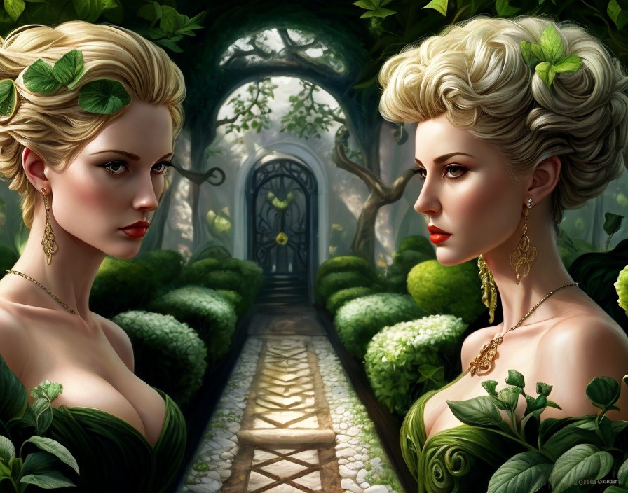 Two women with elaborate hairstyles in lush garden setting with gold jewelry.