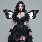 A striking woman clad in a black and white corseted dress with butterfly wings. Her look is adorned with tattoos and accessories, blending gothic elegance with a whimsical, enchanting vibe.