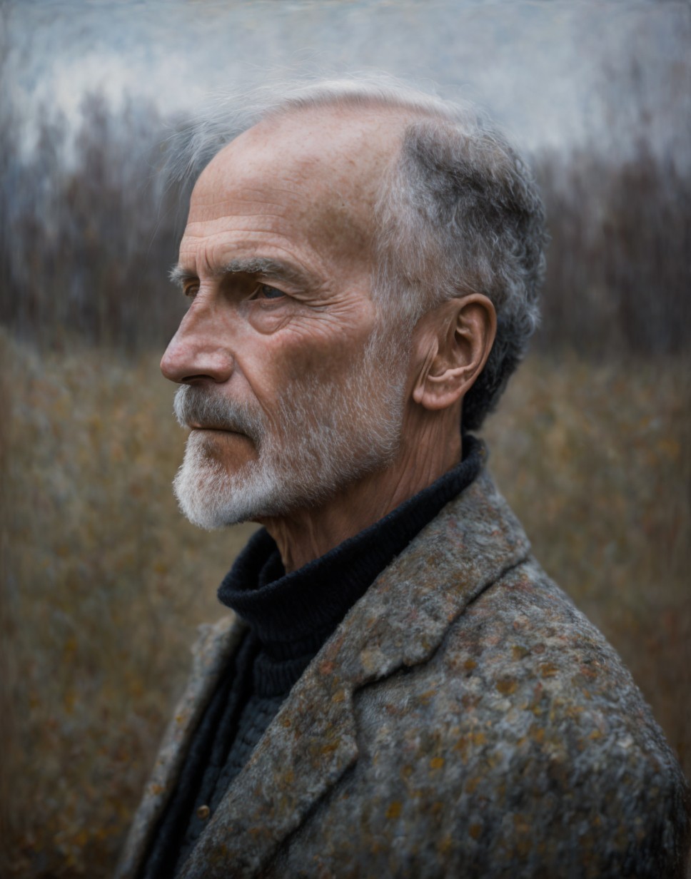 A contemplative man with silver hair and a beard stands against a blurred, muted background. Droplets adorn his face, adding texture to the scene, while his expression conveys introspection.