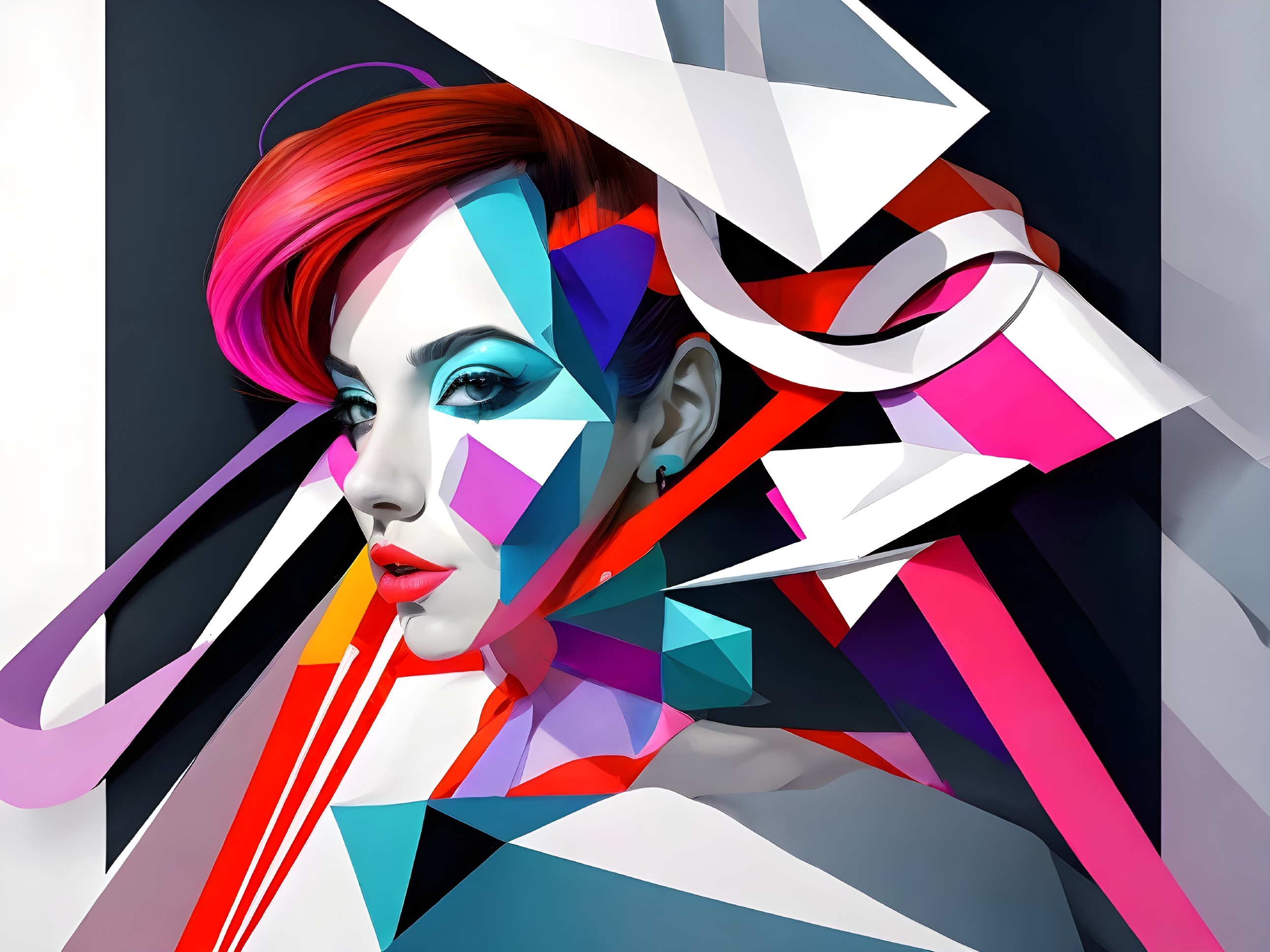 This cubist inspired image features an abstract portrait of a woman, composed of vibrant geometric shapes, bold colours and 3D elements, creating a striking interplay of light, shadow, and form. A pop twist on cubism by LZ.