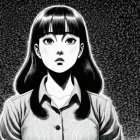 A striking black-and-white image of a futuristic woman adorned with intricate mechanical accessories and a headpiece, set against a complex sci-fi background of gears and circular patterns.