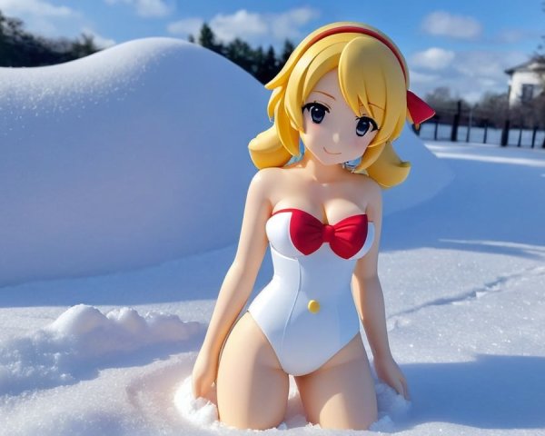 A charming anime superheroine playfully defends her colorful snow fort, her vibrant costume contrasting with the white snow. With a determined smile, she prepares for a friendly snowball fight.