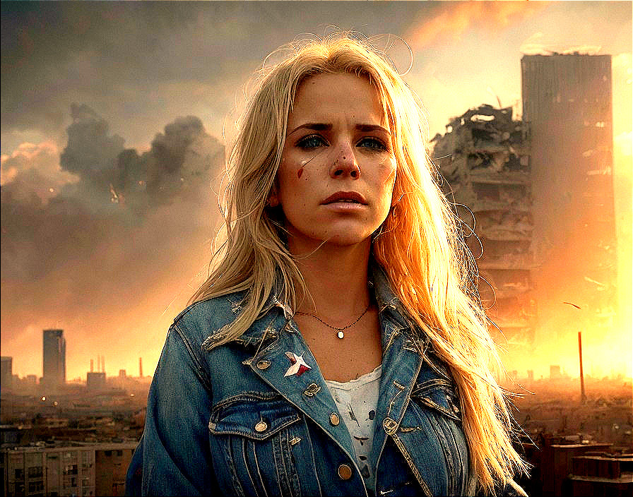 A woman with blonde hair, teary eyes, and a denim jacket appears distraught against a backdrop of fiery devastation.