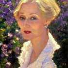 Prompt: Carmen del' Orifice/Julie Harris/J.K. Rowling face, thick impasto oil painting in impressionistic style of Pierre-Auguste Renoir, very mature blonde woman age 65, wide thin red lips, big gaunt cheekbones, blue eyes, wearing red lipstick and a white, ruffled blouse and a black velvet blazer, hair styled in an elegant updo, star-shaped earrings. background is vibrant, blurred mix of purple and green flowers, adding a sense of depth and warmth to the portrait.