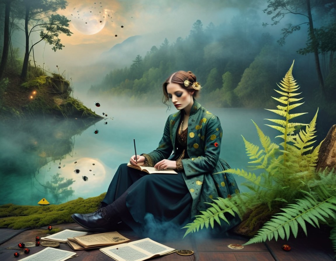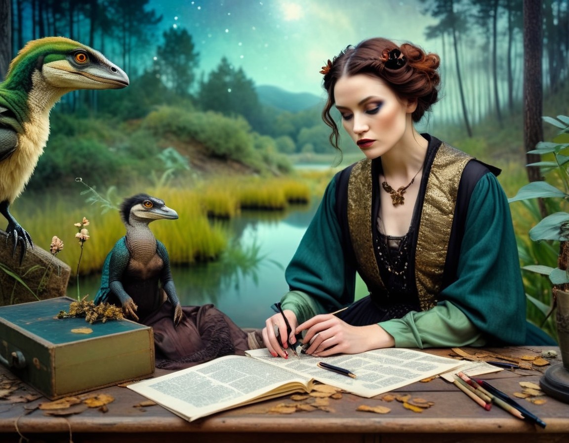 A woman in a historical dress writes at a table, accompanied by a colorful, bird-like creature. The background features a serene landscape with soft lighting, enhancing the enchanting atmosphere.