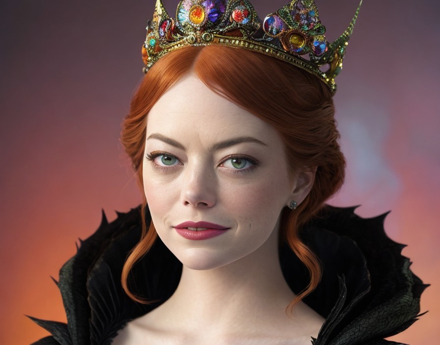 ("Try it" from ANDREMFH) A portrait of a woman with red hair, fair skin, and green eyes, wearing a jeweled crown and black attire with feathered details.